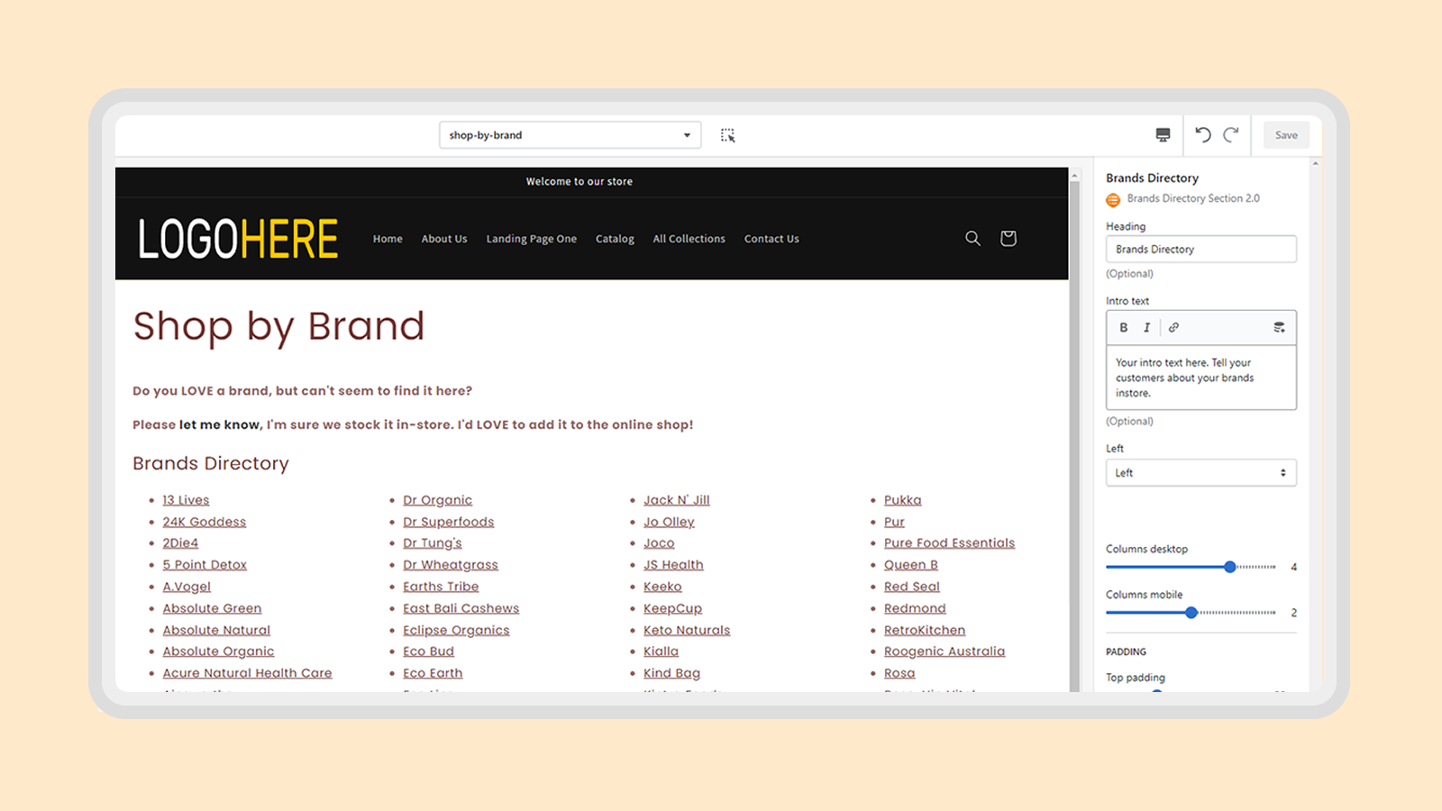 Shop by Brand, Easy add section block to any page or product.