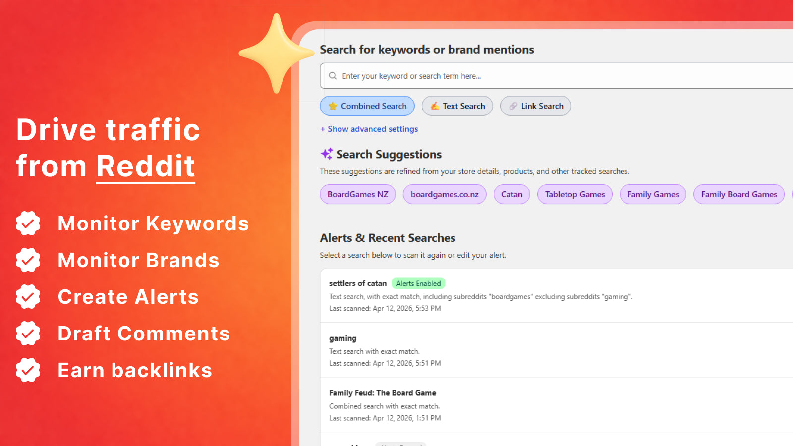 Cross-sharing your website on Reddit and other social platforms boosts visibility by placing your content directly where engaged audiences, search engines, and AI tools can discover it. BrandScan scans and alerts you when it finds Reddit posts and comments that mention your chosen keywords, brand name, website URL, or even competitors. Use BrandScan to find relevant discussions, then use our built-in AI assistant to help draft the perfect comment to build natural backlinks to your website.
