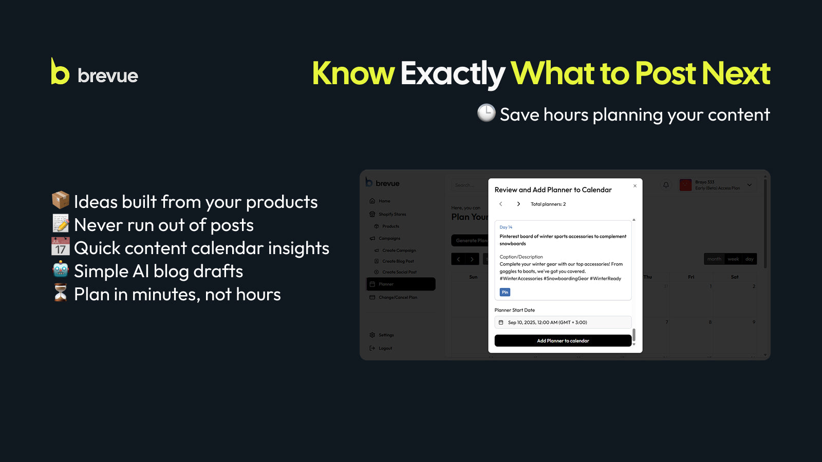 Brevue helps Shopify sellers create product-aware content faster through personalized content calendars and ideas. Save time with timely ideas, event reminders and content tailored to your actual store.