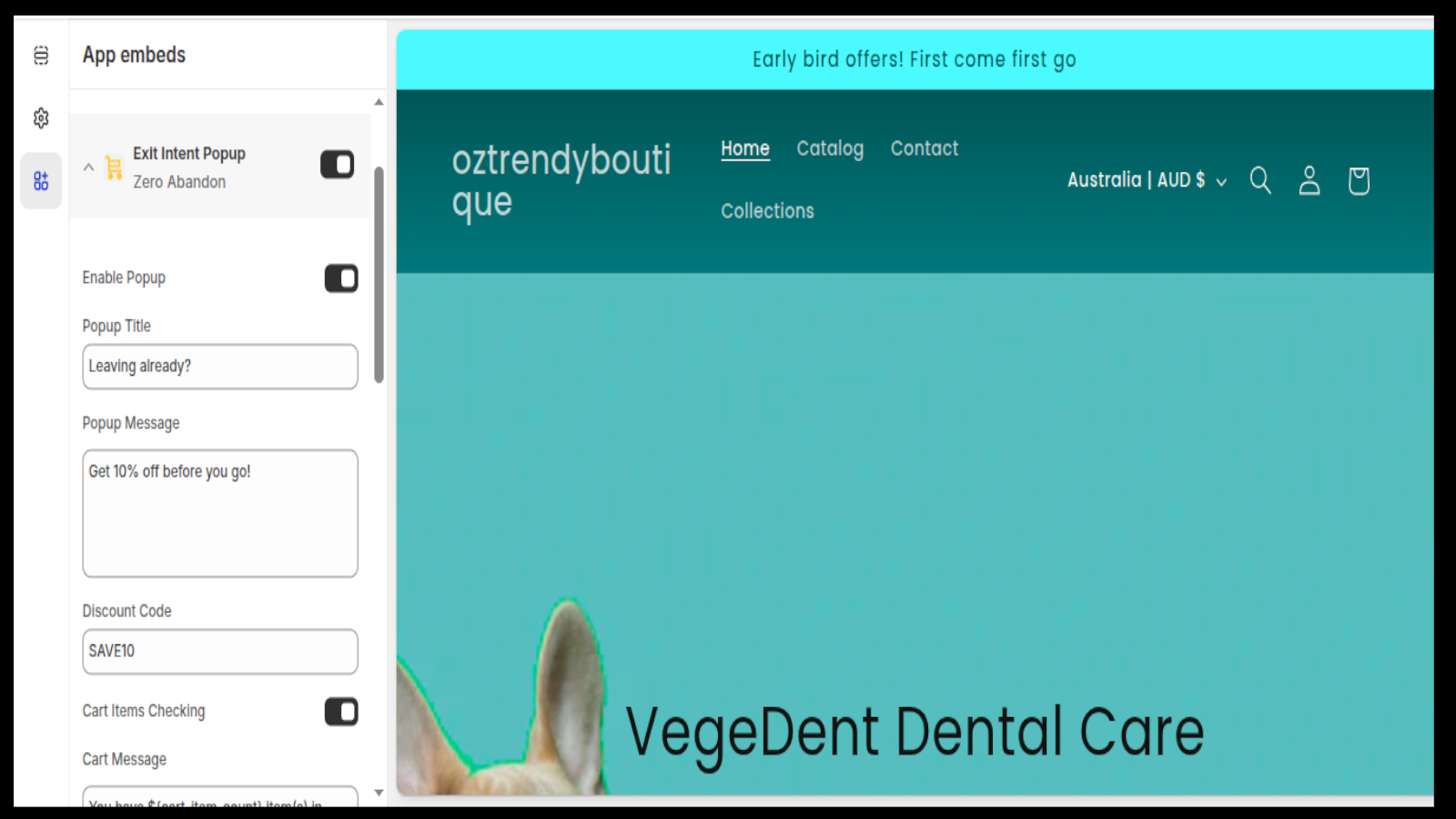 Zero-Abandon helps merchants recover lost revenue by reducing cart abandonment. The app displays a smart exit-intent popup when shoppers attempt to leave, which can be toggled on or off within your theme settings. Merchants can configure the popup to include discount coupons to encourage purchases and capture the reason customers abandon their carts. These responses, along with the abandoned cart items, are visible in the dashboard for marketing insights to improve sales and reduce future cart.