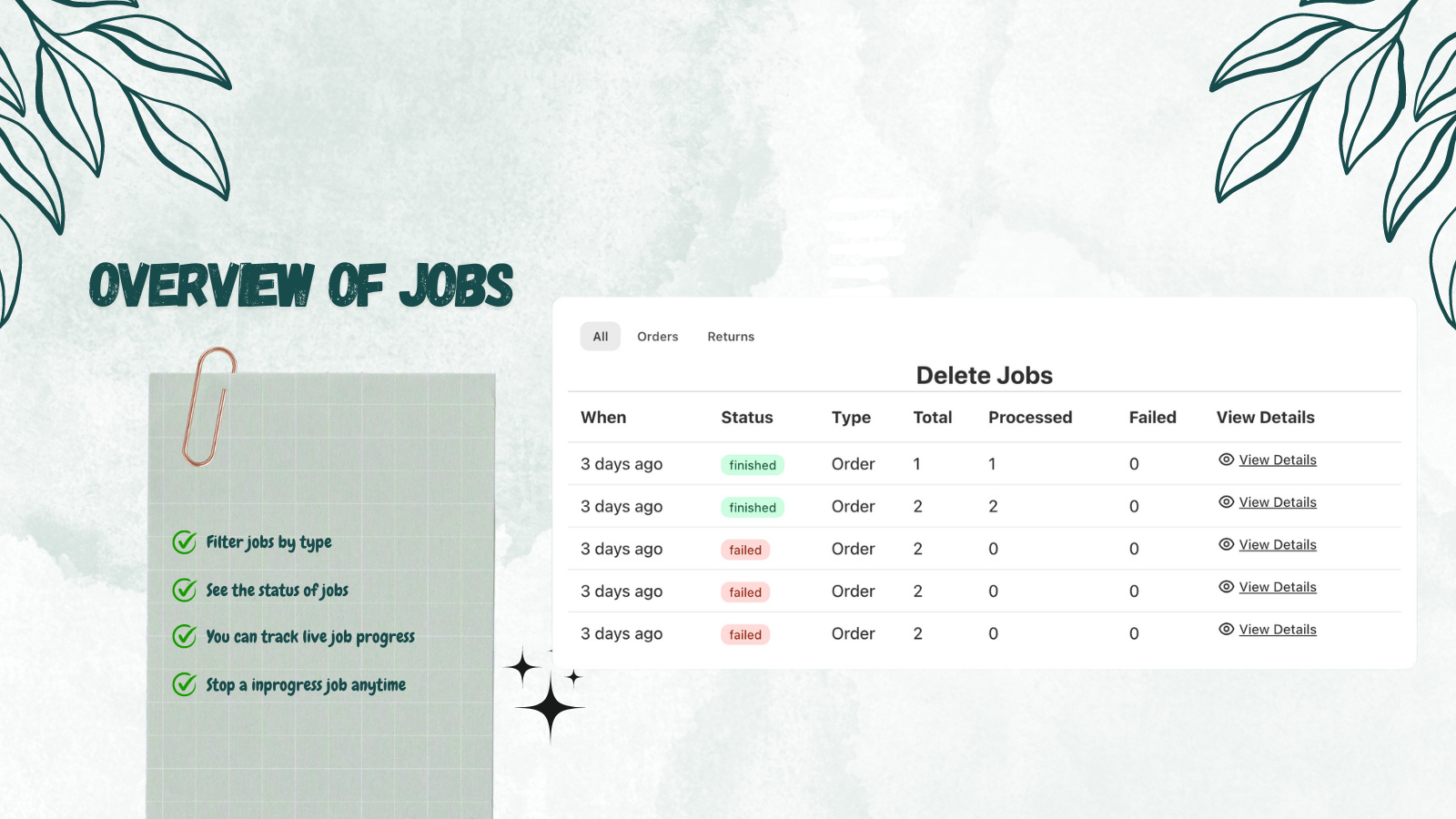 Bulk delete orders or bulk cancel orders. Edit orders in bulk, filter by date, status and customers.