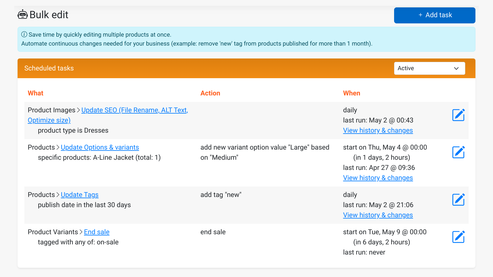 Bulk edit product descriptions, tags, prices, SEO, and more