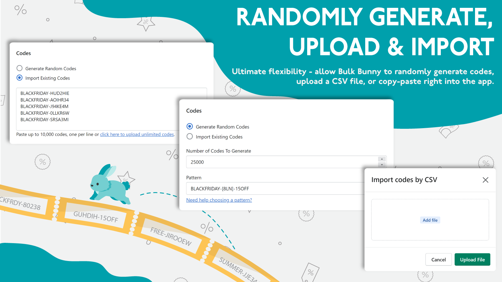 Generate unlimited, unique one-time-use discount codes for your sales, special offers and promotions. If you're looking for an easy way to generate, import, or upload unique codes at a blazingly fast speed, Bulk Bunny is the exact app you need. With an intuitive user interface, all it takes are a couple of clicks and a few minutes to generate all the discount codes you need in bulk. Manage, add, export and lookup your discount codes with our all-in-one bulk discount code generator.