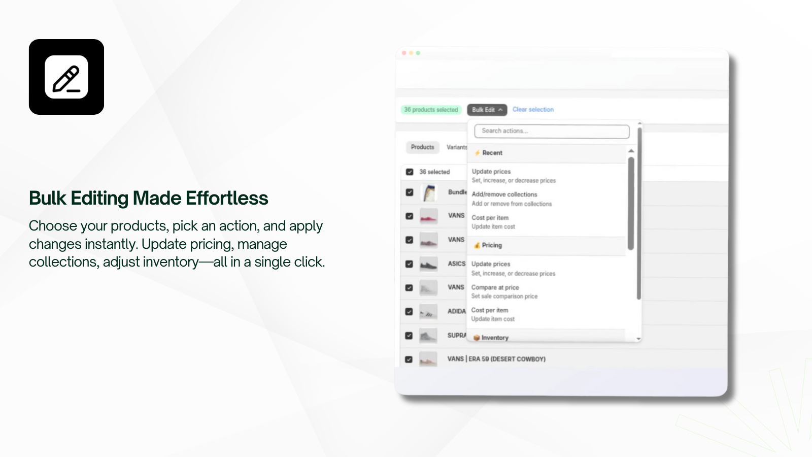 Edit titles, prices & tags in bulk. AI search + SEO optimizer finds and fixes issues automatically.