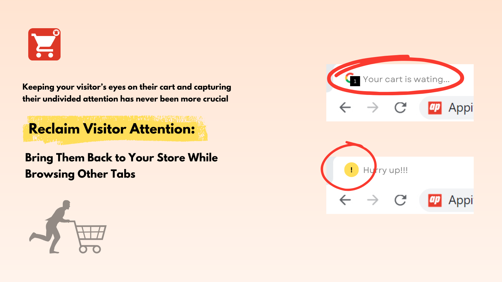 We are in the era of multitasking & multi-tab browsing, visitors tend to jump from one browser tab to another. If you add our app, you can enable a nice little notification that flickers on the store's favicon when the customer moves away and draws attention to the store. This Cart Notification is fully customizable, so store owners can adjust it to match their store's style and design! * 2 different styles (both at In the same price) * 2 different Shapes * Animation * Eye-catchy images etc.