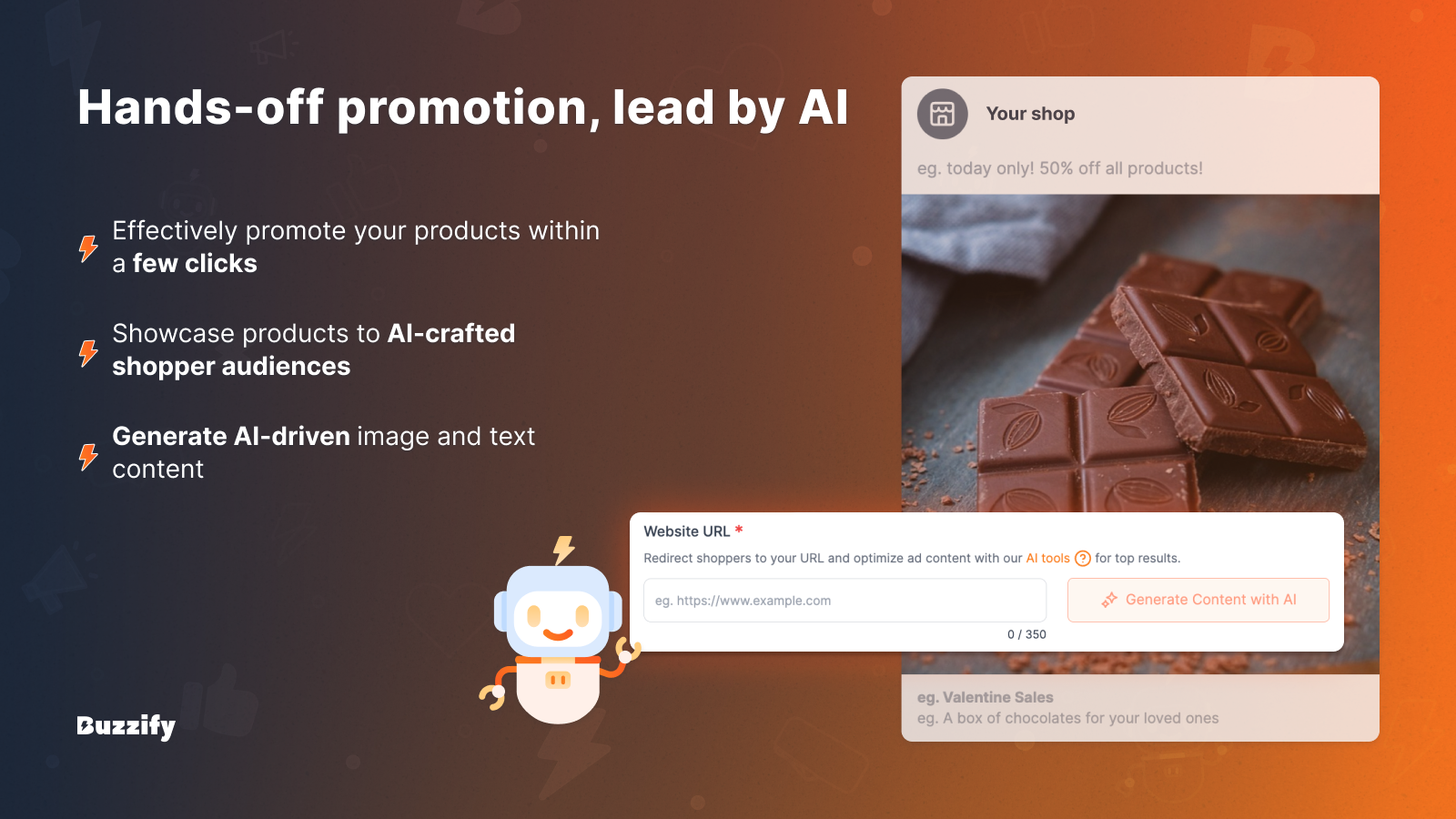 Buzzify makes it easy to showcase your products to shoppers on services like Facebook, TikTok and others, opening your shop to new streams of customers. With AI-powered tools, it can generate your promotional content, saving you from having to think about any marketing effort. Small merchants don’t have time and resources to spend on marketing - Buzzify’s goal is to help them maximize their revenue, regardless of available resources and marketing knowledge.