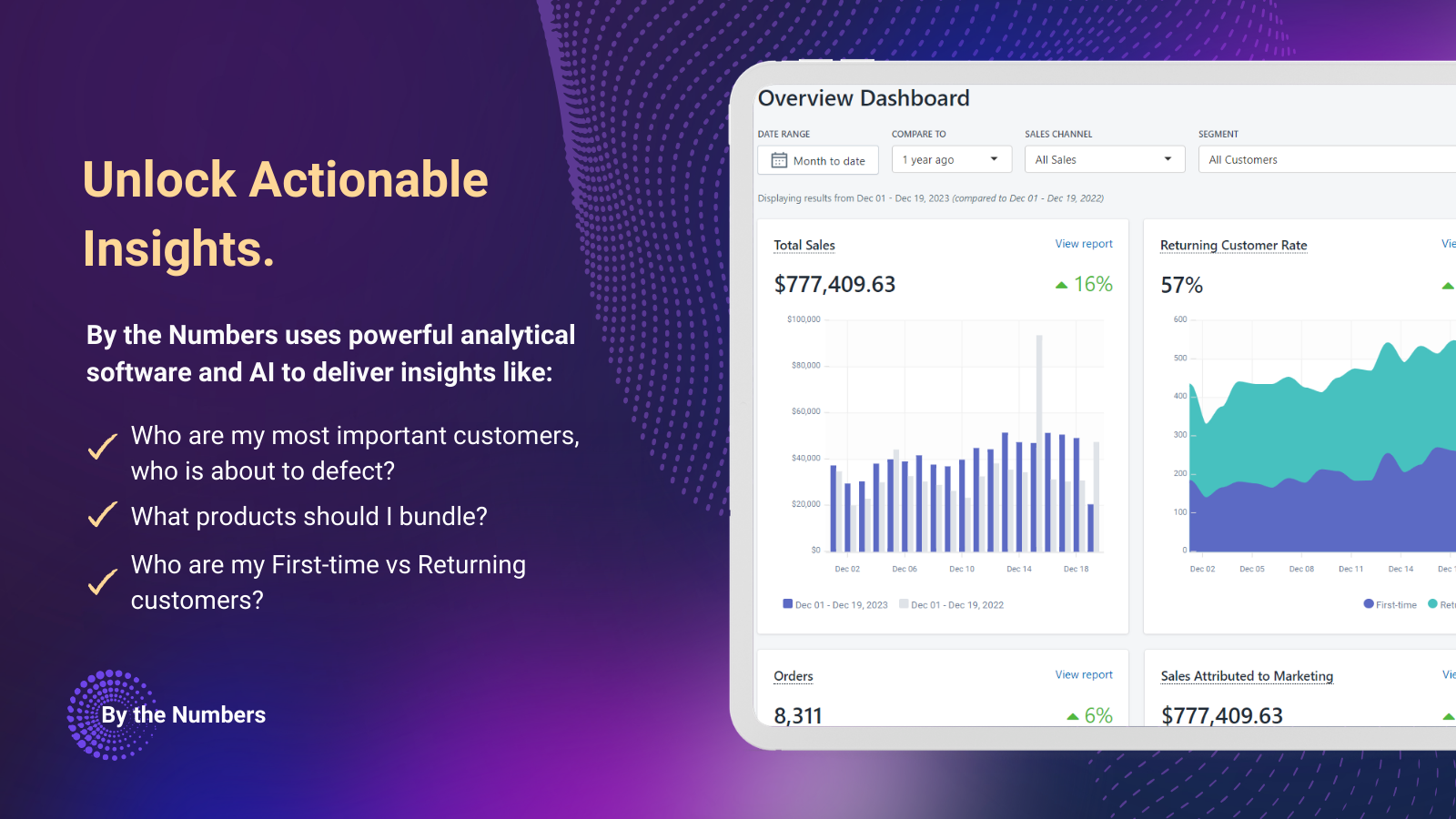 By the Numbers is a dashboard suite of powerful analytics tools that empowers you to decode business performance, build customer loyalty, optimize discounts, curate winning product bundles & more. It features tools like Customer Lifetime Value, Cohort Retention, & Repurchase Analytics. View your customer audience in segmented groups like “Most Loyal” & “Defecting” allowing you to craft targeted campaigns with better insights. Integrate with Google & Klayvio to save time & reach your audiences.
