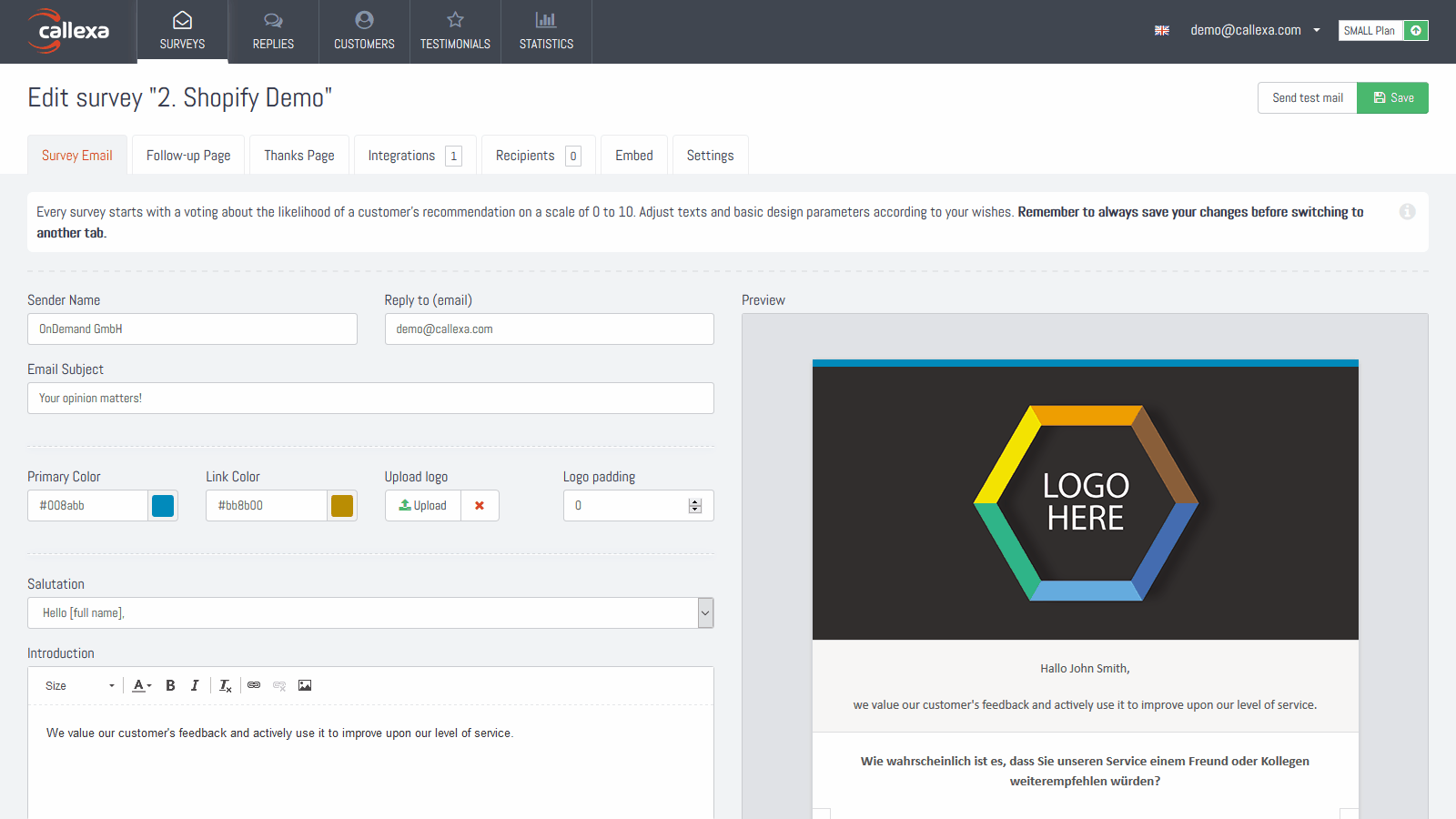 Install Callexa to send automated surveys based on the Net Promoter Score* after an order has been shipped. Incoming ratings and comments can be synced back to your Shopify order entries or browsed through our convenient dashboard with statistics and reporting functions. Evaluate your shop, service and product quality, get feedback from your customers and track improvements over time. * "Net Promoter Score" is a service mark of Bain & Company, Inc., Satmetrix Systems, Inc., and Fred Reichheld.