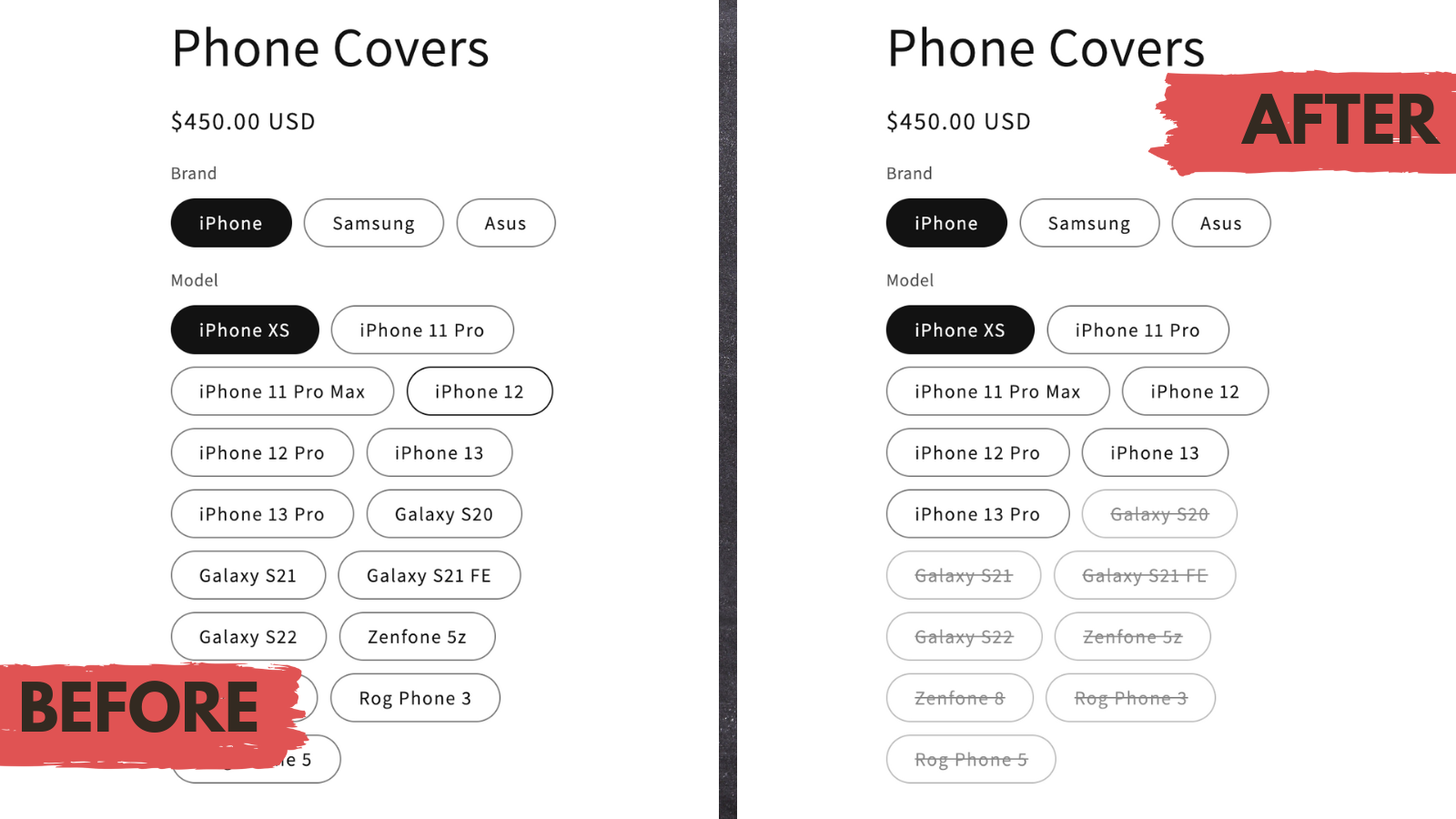 Easily hide/disable sold-out or unavailable or any other variants with Camouflage.
