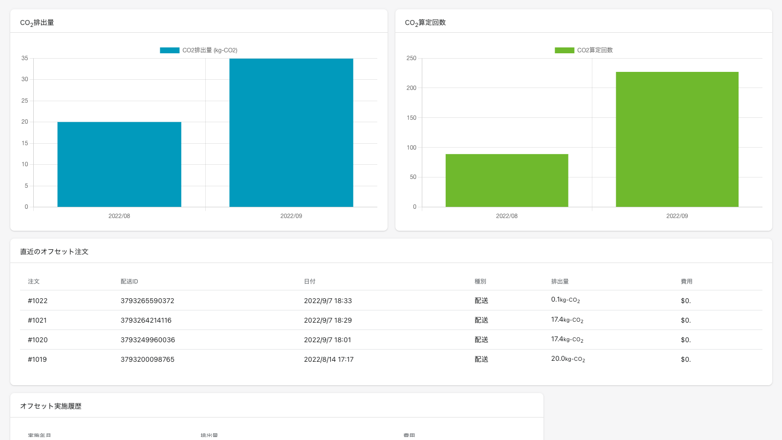 商品ページ向けに CO2 排出量を表示する App Block を提供します。また商品の配送ごとに CO2 排出量を算定し、CO2 排出削減・吸収クレジットを購入することでオフセット(相殺)します。