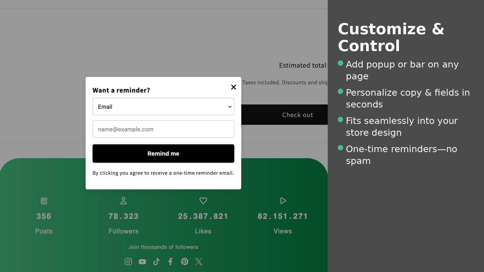 Cart Reminder Newsletter Opt-In captures email or SMS consent at cart or when a shopper is about to exit. Add a widget or popup, choose triggers like time on page, exit intent, or minimum cart value, and customize the copy. The app creates or updates the customer and applies tags, enabling reminders through Shopify Flow or your preferred newsletter tools. The app does not send messages itself and can be configured for non-EU compliance requirements.