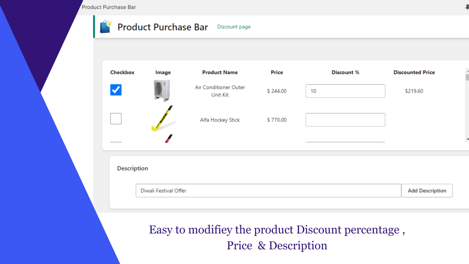 Introducing the Sticky Discount Product Purchase Bar app – your secret weapon for making product announcements, offers, and sales truly irresistible! You can effortlessly create eye-catching displays featuring product images, prices, discounts, and captivating offer descriptions. Brace yourself for a shopping revolution as the Sticky Discount Product Purchase Bar takes center stage, showcasing the highlights that matter most – enticing visuals, unbeatable discounts, and a tempting "Add to Cart"