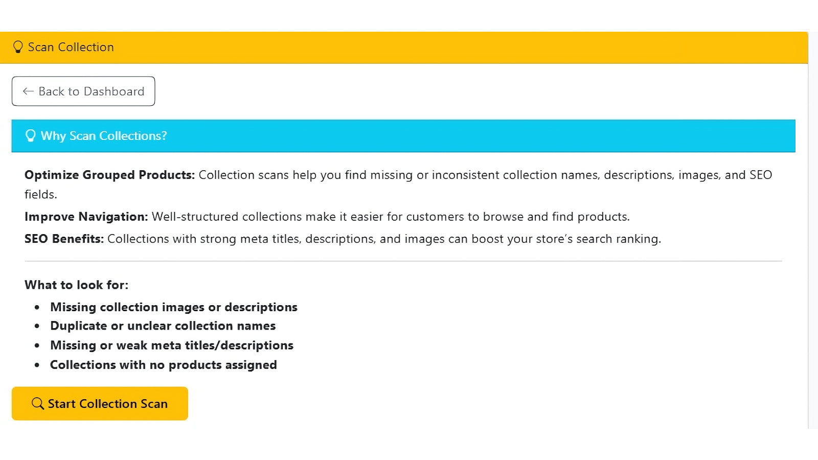 Catalog Copilot scans your store for issues across 14+ critical product attributes like title, SKU, barcode, alt text, and SEO content. It analyzes collections for missing images, descriptions, or inactive product mapping. Instantly identify products and collections with active discounts applied via compare-at prices or Shopify Discounts. Easily audit and manage active promotions to ensure a consistent, optimized catalog.