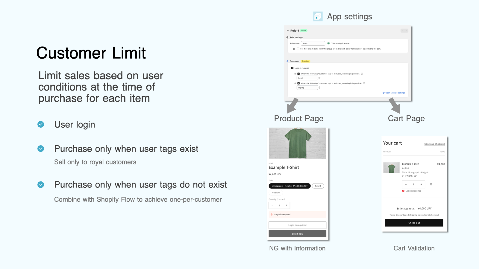 Quantity limit (from x to y items), Term limit (from x month x day to y month y day), Simultaneous purchase limit (cannot purchase product A and product B at the same time), Customer Limits (required login, customer tags) can be applied your shop. Products can be selected each products variants and products tag and products collections.