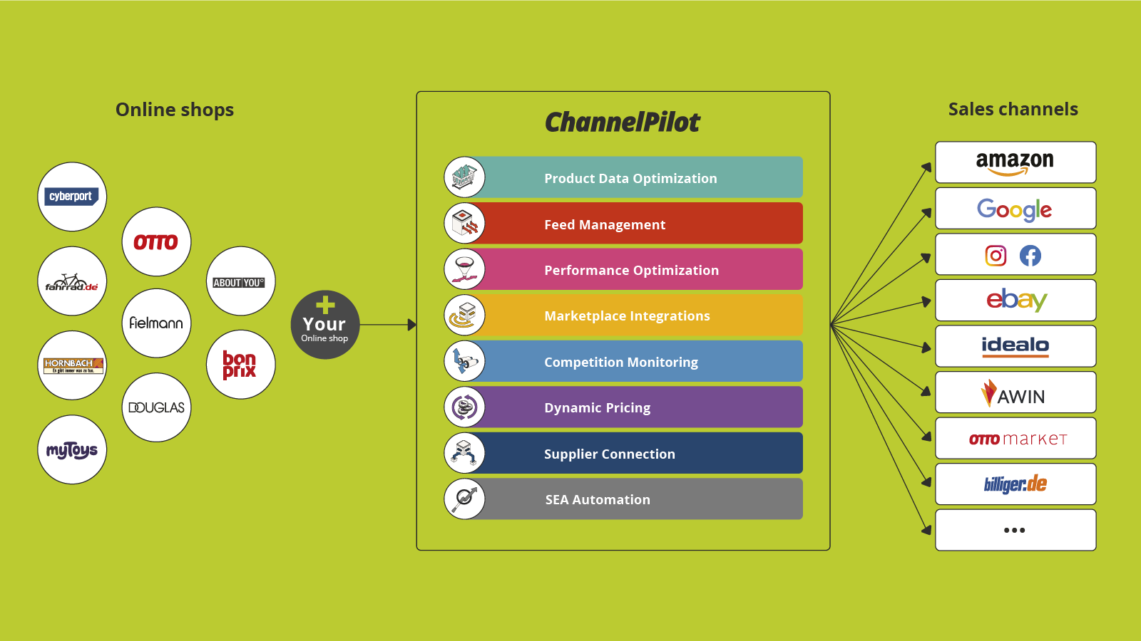 Channel Pilot Pro is a cloud-based product data management tool. It allows you to export products to a variety of platforms, social networks and marketplaces worldwide and optimise them so that they are listed in the best possible way. You can monitor changes in market prices on all channels and dynamically adjust your own product prices if desired. With performance optimisation, you can immediately see which products are profitable on which channel and react accordingly.