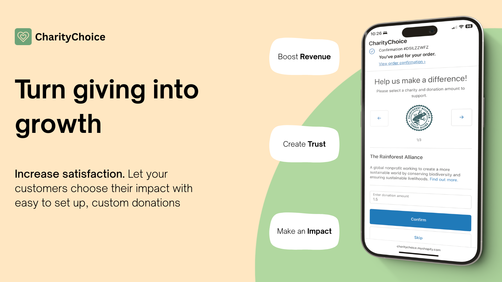 The donation management app that lets your customers choose their impact and donate to one or more custom charities. No complicated set up, no coding required, and no hidden costs. Donations must be made to charities manually. Create trust with your customers and turn giving into growth! Note: This app adds secondary payments to orders when a customer donation is selected.
