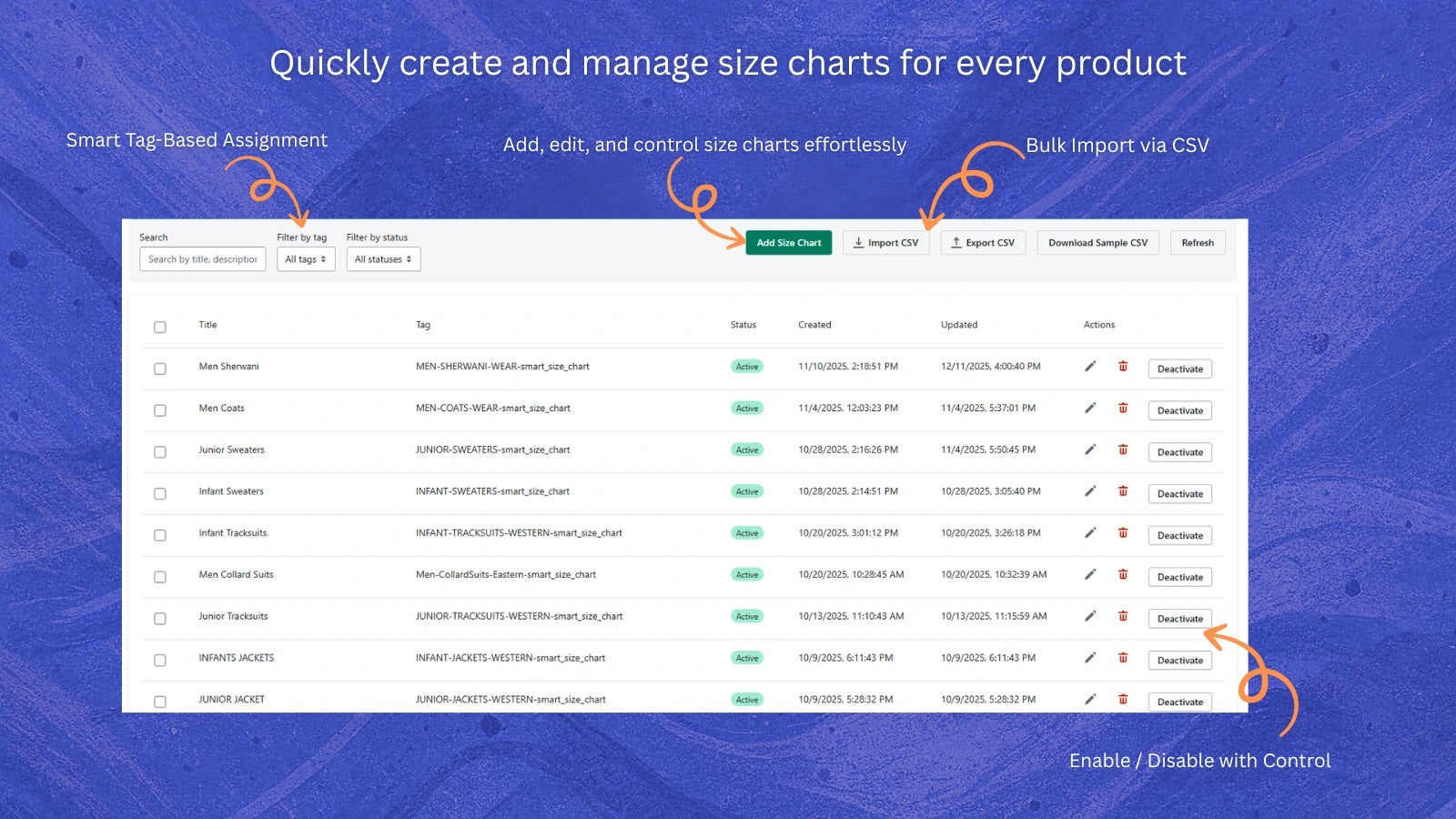 Easily create, upload, and manage unlimited size charts — single or bulk — for all your products