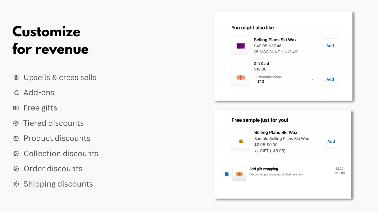 Increase revenue with checkout page customizations powered by Checkout Extensibility. Drag and drop checkout blocks to show upsells, cross sells, custom fields, dynamic content, text, links, images, trust badges, address validators, and more. Set display rules based on flexible cart conditions. Migrate script editor changes to no-code payment & shipping customizations & discounts powered by Shopify Functions. Support for Thank you & Order status pages included.