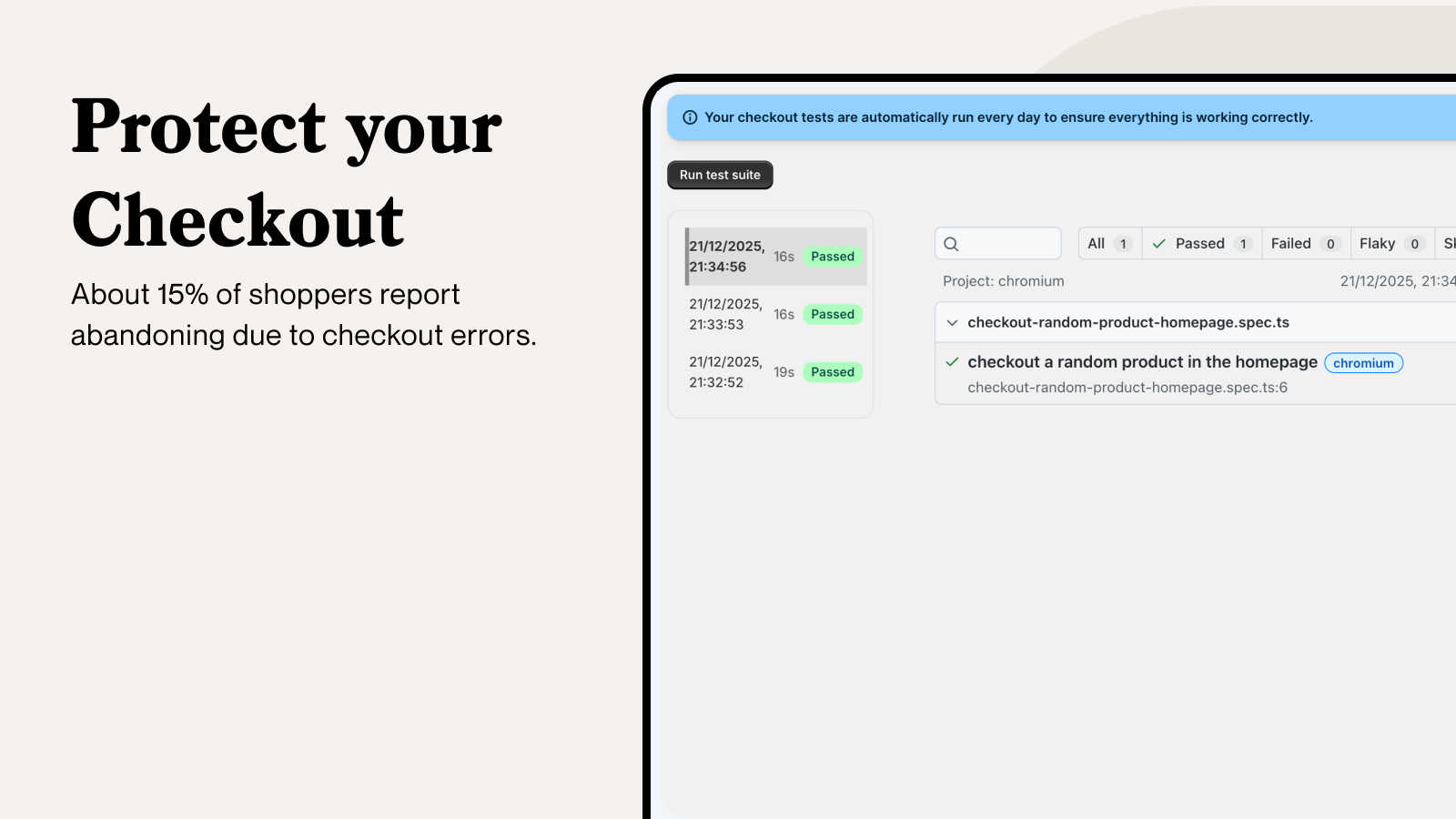 This app helps merchants detect checkout problems soon after changes to their store, such as theme updates, app installs, or configuration changes. It runs a set of automated checkout tests that we provide. The tests simulate real customer behaviour by opening your storefront in Chrome and navigating through the checkout flow like a shopper would. If a test fails, the app sends a notification so issues can be identified sooner.