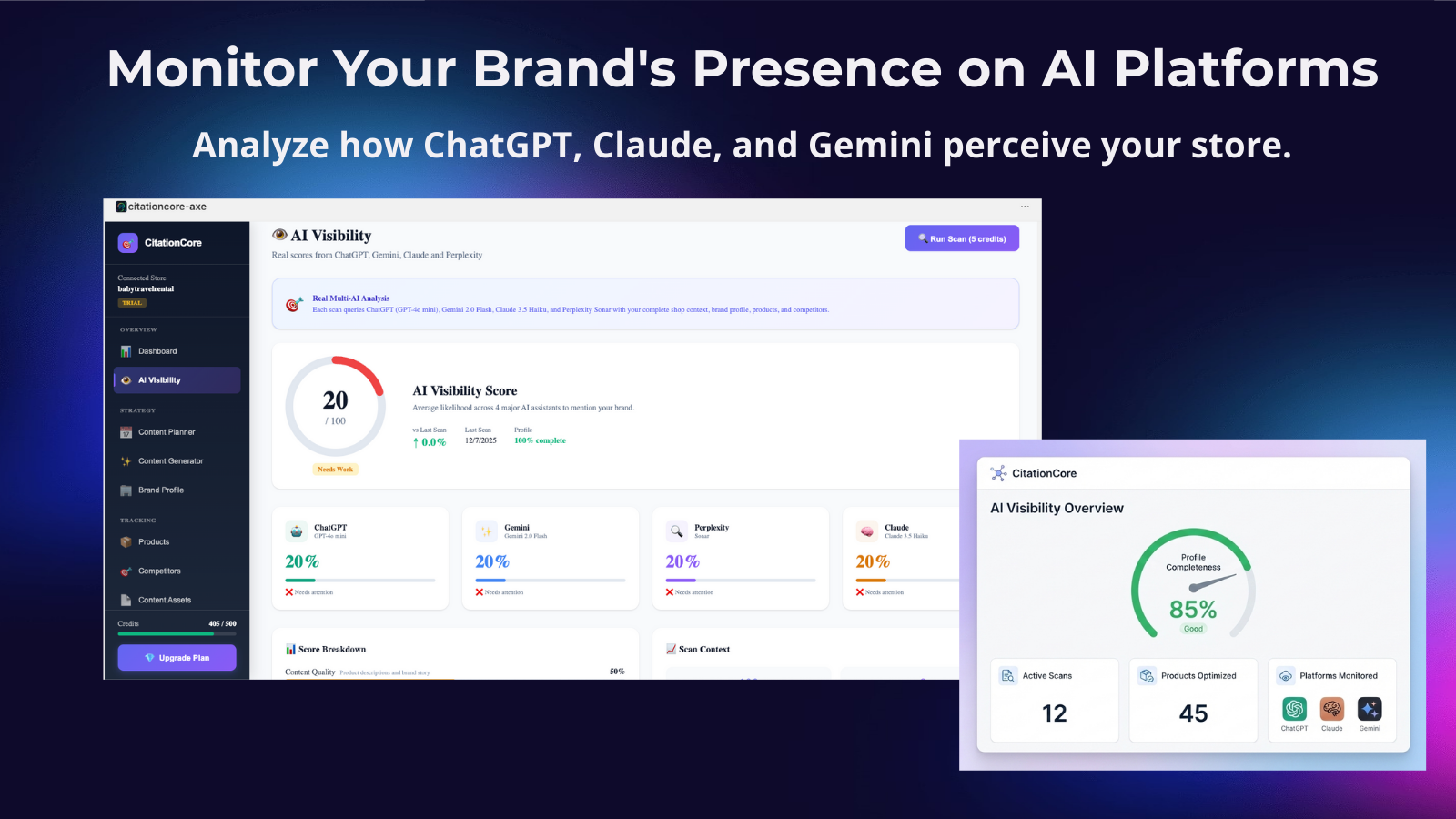 Optimize your store for AI search assistants like ChatGPT, Claude, and Gemini. CitationCore helps improve your discoverability on these platforms. Visibility Audit: Track how your brand appears in AI responses. Content: Generate descriptions and FAQs tailored for AI readability. Technical: Automatically build your llms.txt file for crawlers. Prepare your store for the new era of AI search.
