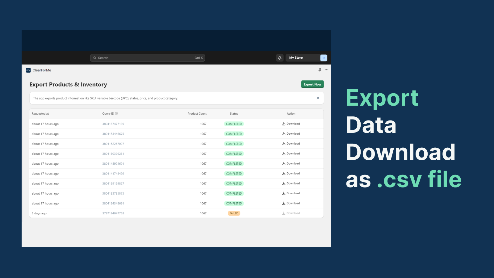 ClearForMe app streamlines product data downloads and exports. Easily export and download product information in CSV / XLSX file format—product detail batches in moments, one click to export. Manage and monitor export jobs. Review download success/failure status and alert who needs to know. Export sheets will contain the product name, SKU, variant barcode (UPC), brand, status, and other details.