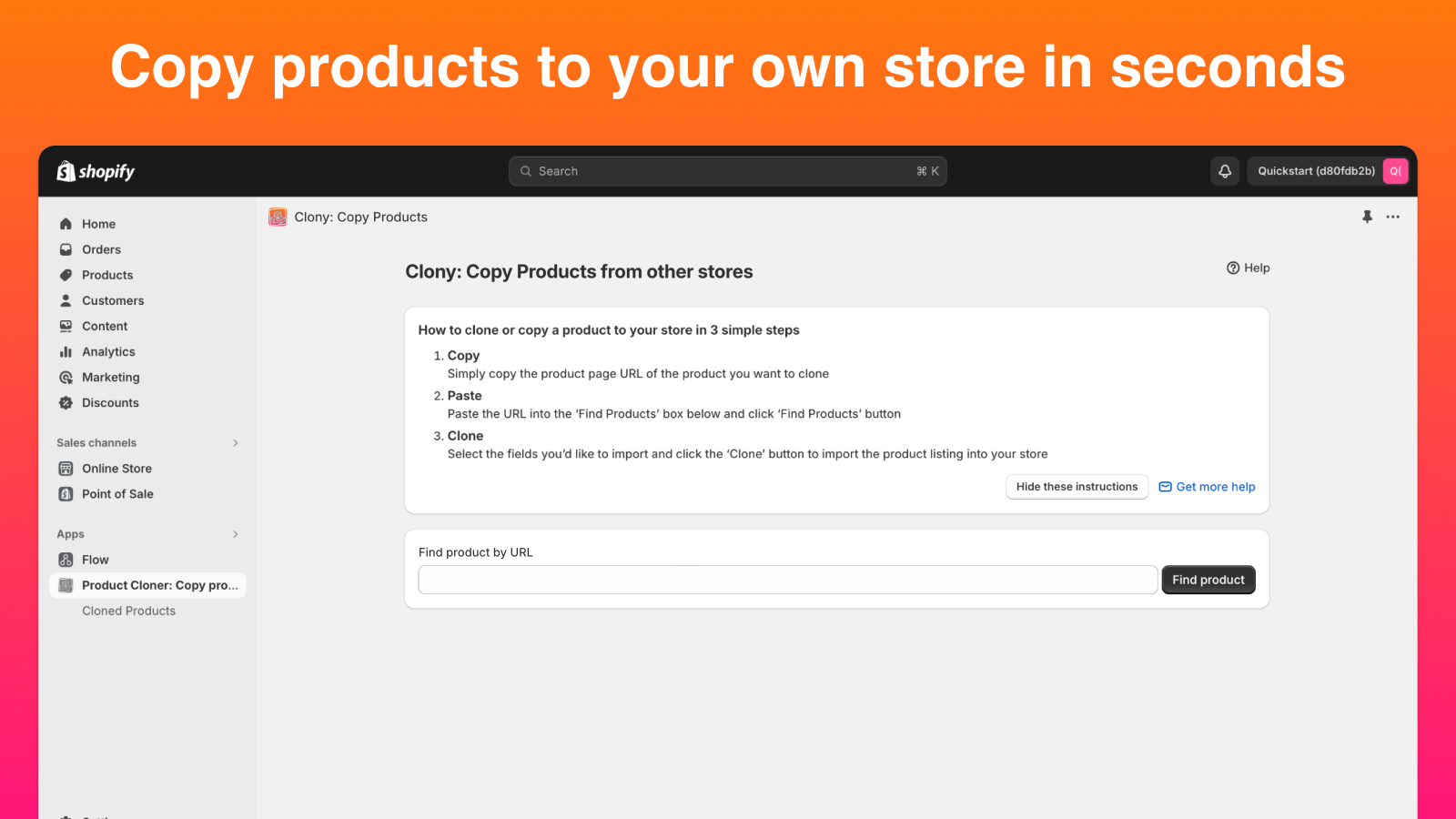 Clony is the ultimate tool for Shopify store owners who want to quickly and effortlessly copy products from their other stores to their own store. Whether you're looking to copy products for drop shipping,. streamline your inventory process, expand your product range, or save time on product creation — Product Cloner is here to help. Use this to save time, adding popular products from leading stores, expand product range.