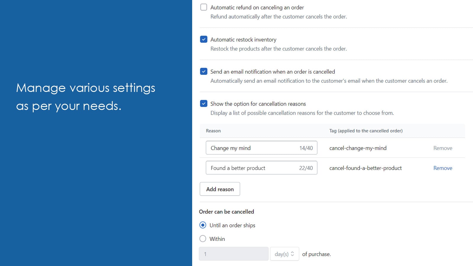 Codify Order Cancel helps you provide options that allow customers to cancel orders that are not fulfilled and reorder the same order from the order status page as well as from the account and the order page. This makes the order cancellation process simple, as customers can cancel the order with just a few clicks without contacting customer support and waiting for a reply. You also have the option to automatically restock items after order cancellation, which will reduce your work.