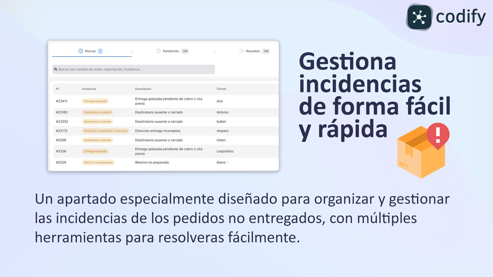 CodifyCRM automatiza todo tu proceso, desde que creas la etiqueta, hasta que el pedido es entregado a tu cliente. La única especialmente diseñada para tiendas contra reembolso, con todo lo que necesitas en un mismo lugar. Integrada con las empresas de transporte mas importantes, en CodifyCRM; Confirmas pedidos, generas etiquetas, monitoreas estadísticas de entregas, gestionas incidencias, visualizas tu stock, y más. Deja atrás las múltiples suscripciones, y escala tus tiendas al siguiente nivel