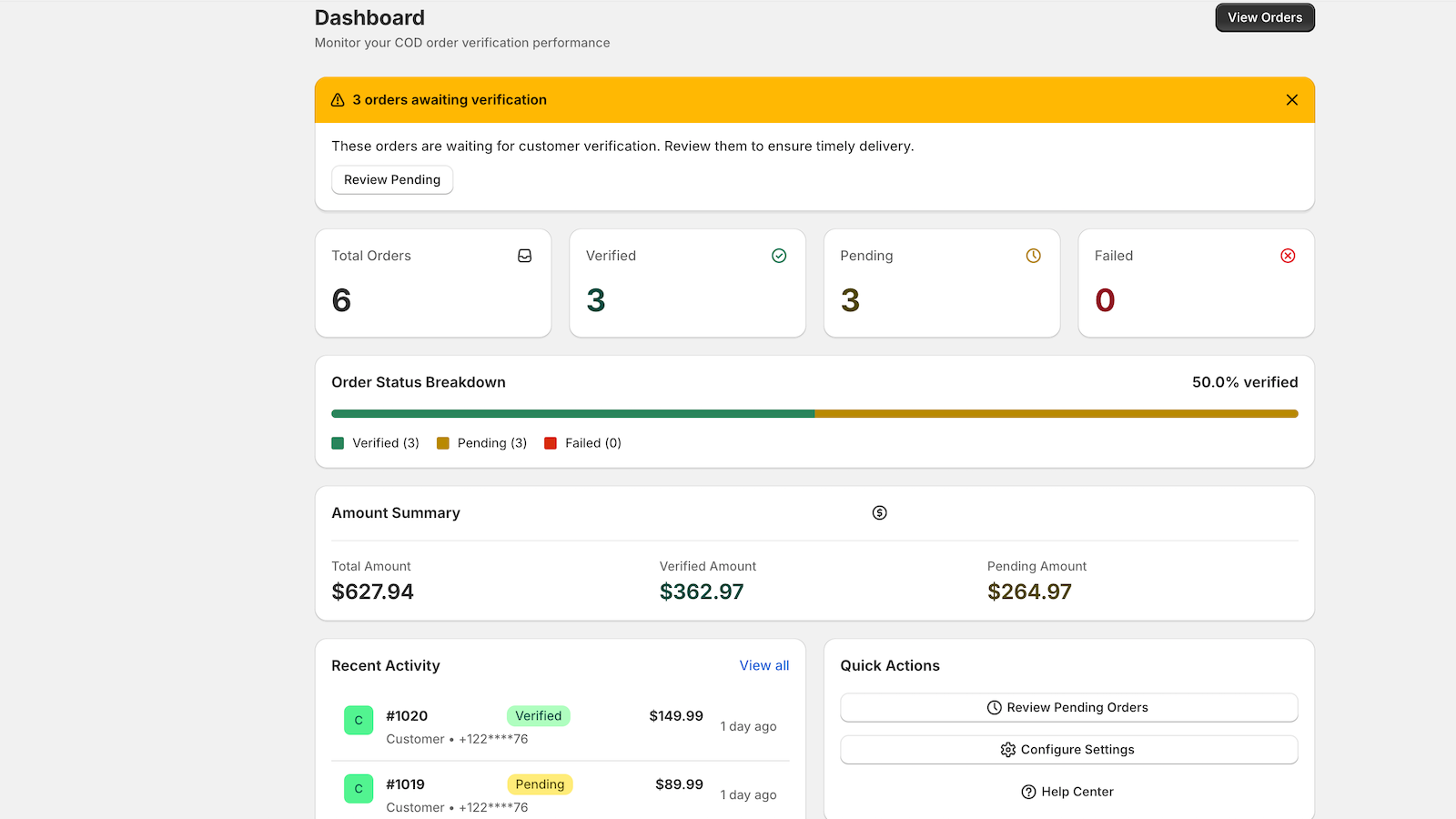 COD Verifier helps merchants who accept Cash on Delivery payments confirm orders before shipping. When a customer places a COD order, they receive a verification code via SMS or WhatsApp. Orders are marked as verified only after the customer confirms the code. This reduces losses from fake orders, prank purchases, and failed delivery attempts. The app includes a dashboard to track verification status, manage pending orders, and view analytics.