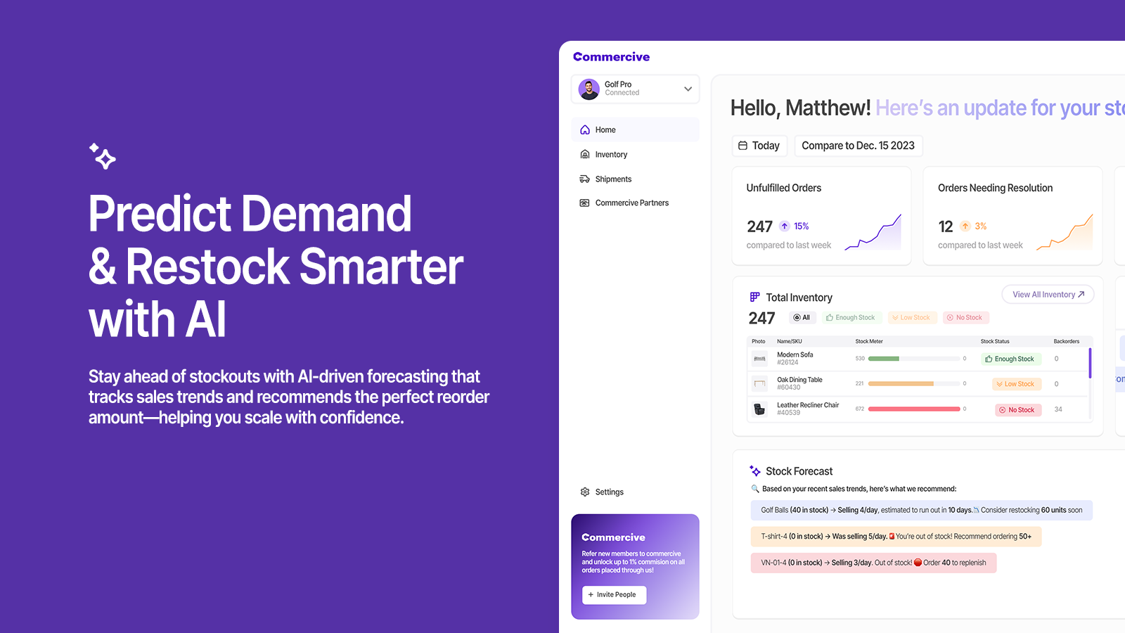 Commercive helps Shopify brands control inventory and fulfillment with AI automation. Forecast demand and restock automatically with smart predictions. Track orders in real time from fulfillment to delivery. Earn commissions through a built-in referral system. Sync inventory and sales data with Shopify to keep operations accurate and profitable. Commercive makes management simple and scalable—get started today!