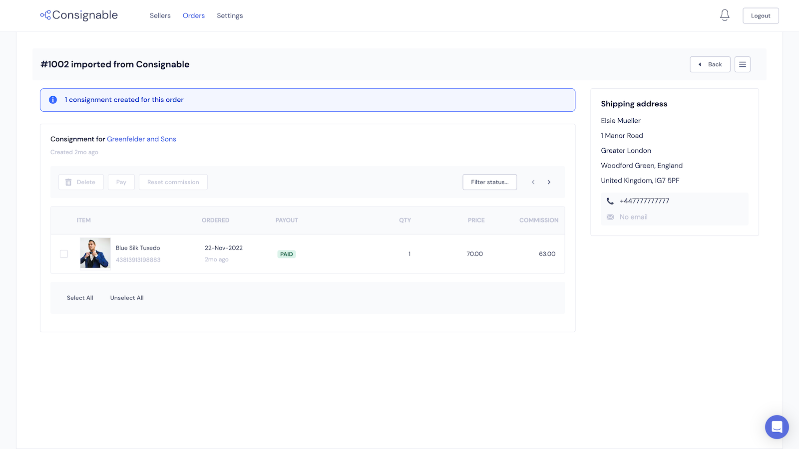 Consignable streamlines, simplifies and automates your consignment operations, including inventory management, order management, payments and more. As orders are imported, consignments are automatically created. Your sellers will receive notifications for each order and payment. Plus have access to their own branded portal to track and export data.