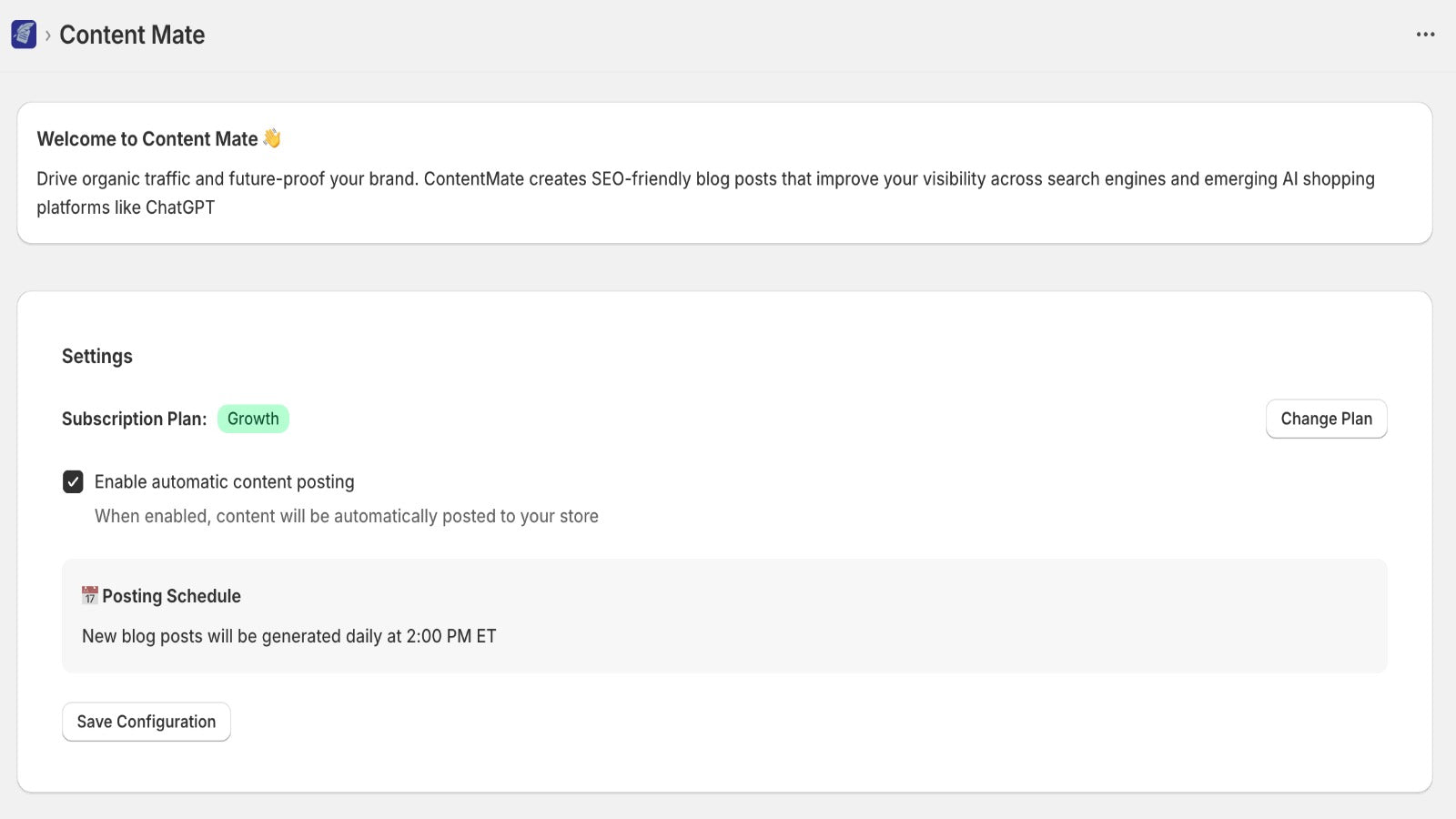 ContentMate helps your Shopify store improve its online visibility using AI. It automatically generates SEO (Search Engine Optimized) and AEO (Answer Engine Optimized) blog posts from your products, making your store easier to find on search engines and the new age AI-assisted shopping platforms like ChatGPT. With ContentMate, you can publish fresh content consistently, strengthen your brand presence, and stay ready for the next generation of online shopping - all on autopilot