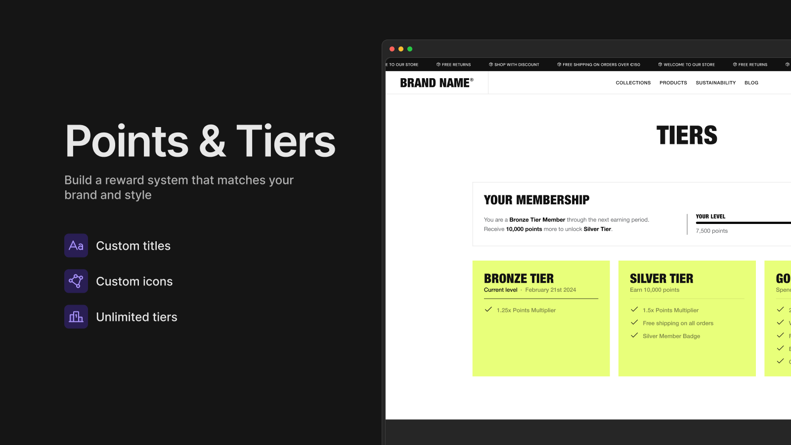 We know that the real value of your customers begins after their first purchase. That is why we help build an exciting program unique to your brand. Easily reward purchases and loyalty activities. Customize your own points and tier system. Host creative competitions and challenges to gather members' content and input and excite your customers. Fully compatible with Shopify Markets, separate Shopify stores, multi-language, and multi-currency.