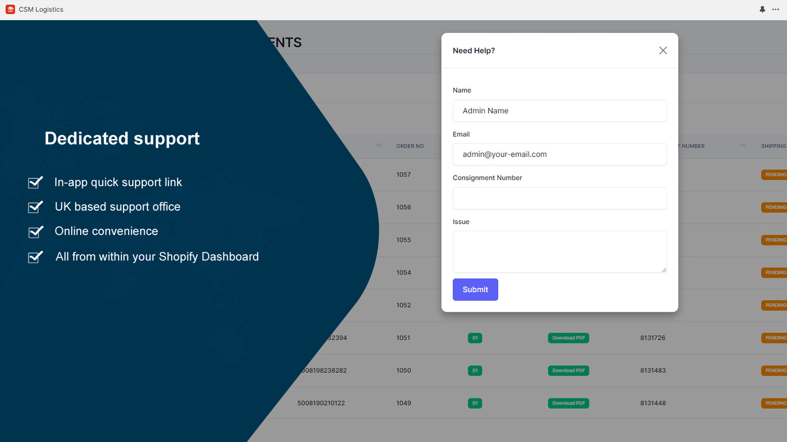 CSM Logistics Shopify App: Automated Label Generation for Streamlined Shipping. Simplify your workflow as our app seamlessly integrates with Shopify, automating label creation with CSM Logistics. No more manual tasks - orders trigger automatic label generation, enhancing efficiency. Enjoy the convenience of a user-friendly interface, hassle-free setup, and dedicated support for a seamless shipping experience. Say goodbye to tedious label creation and let CSM Logistics take care of it.