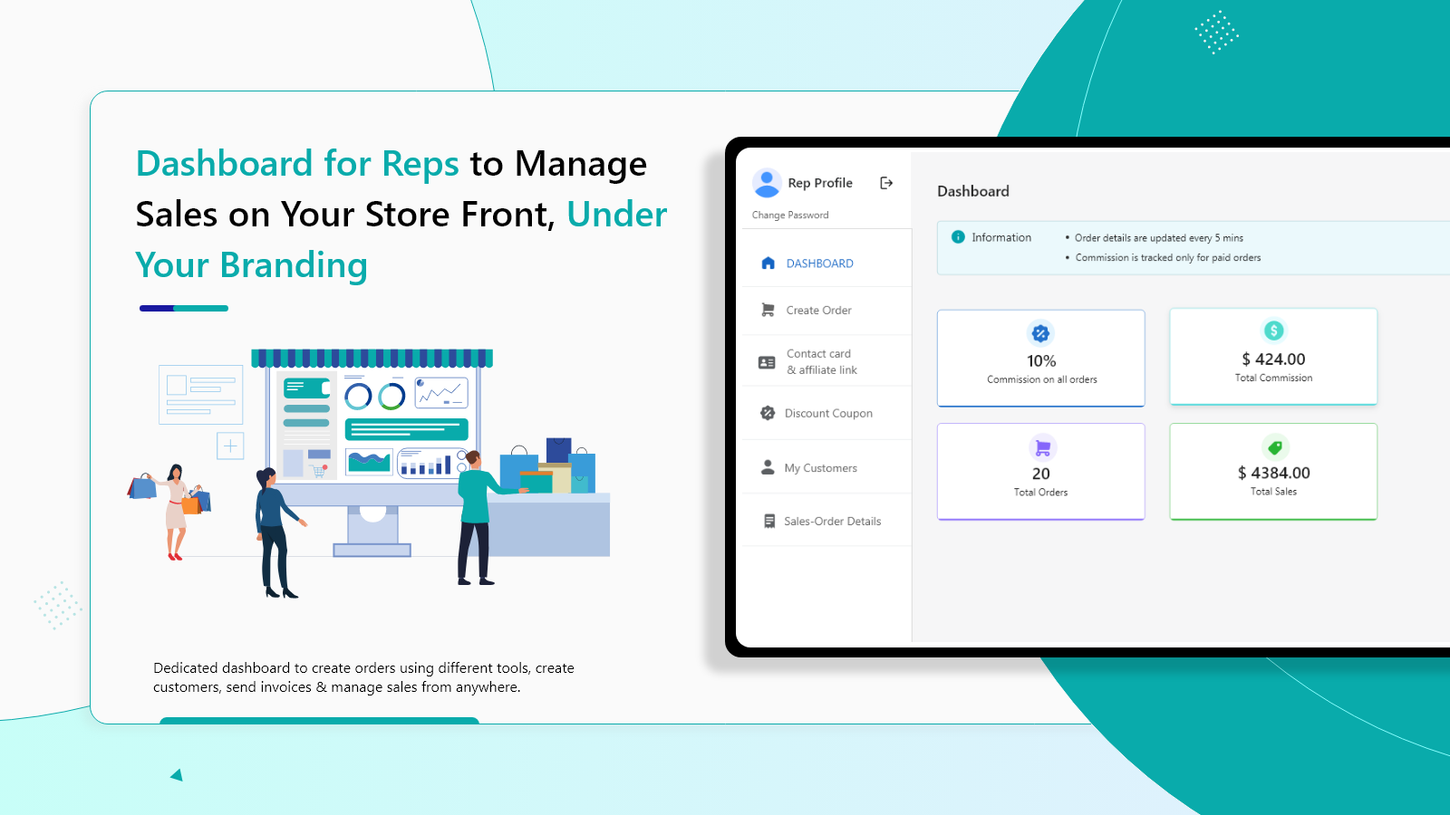 CSS Sales Team app helps to keep track of all orders & commissions. You can set up general commission structures available in the app, or you can request for customized commission structures. Give your sales rep their own dashboard on your shopify front end under your branding, where they can create orders, share affiliate links & discounts coupons, manage customers and view their orders & commissions. CSS Sales Team app can help you to increase customers, revenue & brand value.