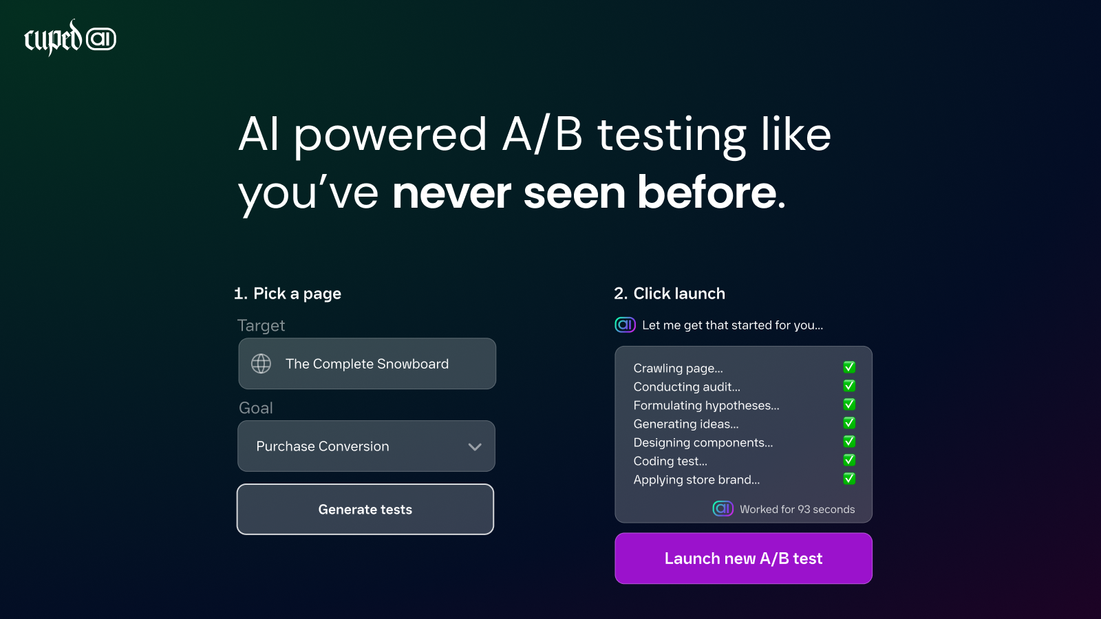Cuped.ai is an AI-driven A/B testing tool built specifically for Shopify stores. Automate your conversion rate optimization (CRO) strategy without any coding. Instantly audit product pages, collections, carts, or any page to discover hidden UX friction, then launch branded, ready-to-deploy variations with one click. Cuped.ai generates personalized test ideas and code optimized specifically for Shopify themes, saving you hours of development and boosting sales faster than ever.
