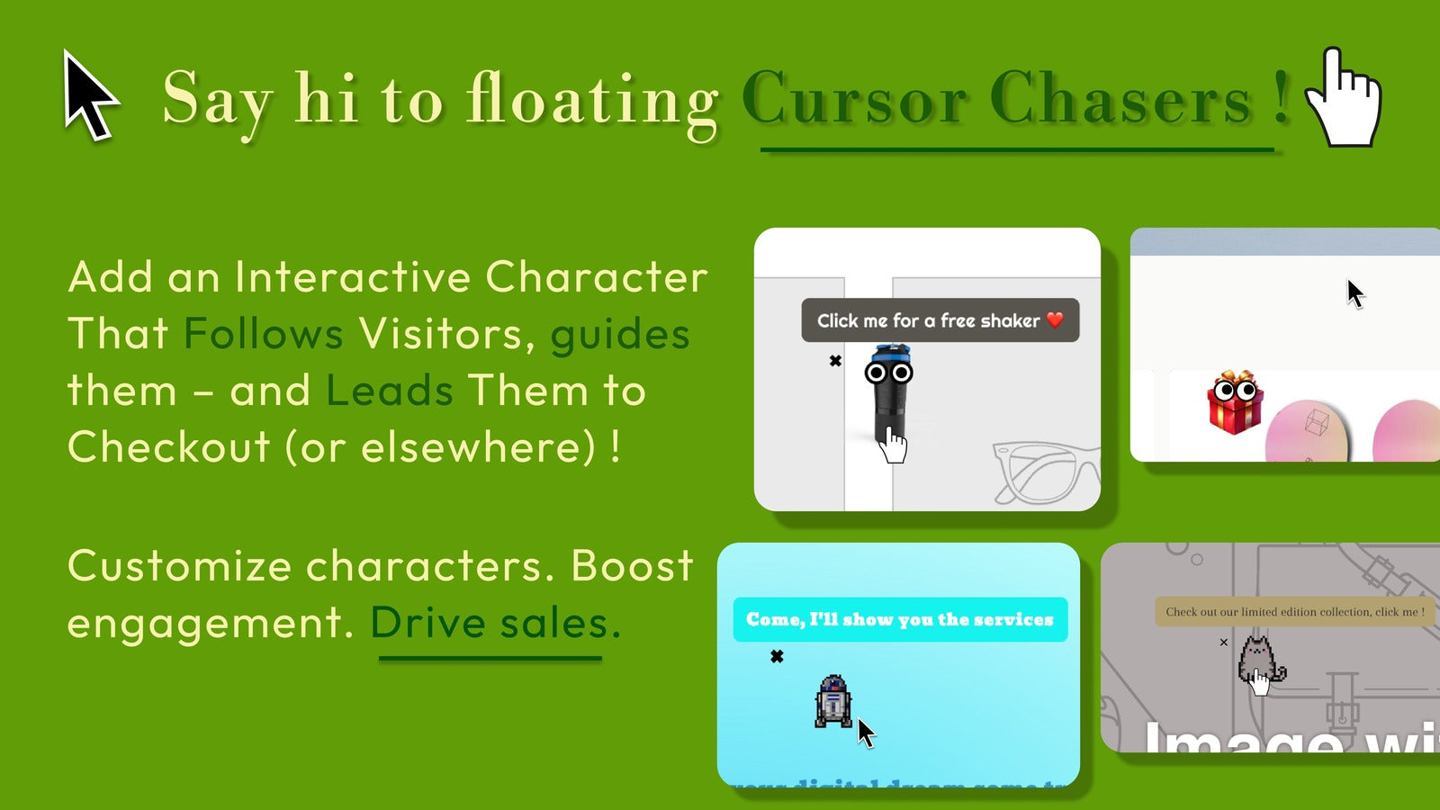 This app helps merchants create custom characters—based on their products, mascots, or brand elements—that track the shopper’s cursor as they browse. The characters blink, follow movements, and can redirect customers when clicked, turning browsing into a fun, interactive experience that increases time on site and encourages conversions. Focus on engagement and delight visitors with interactive animations that react to clicks and blinks.