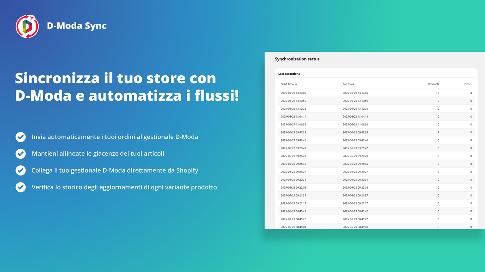 Connettore per il gestionale D-Moda: aggiorna giacenze, invia ordini e sincronizza stati facilmente.