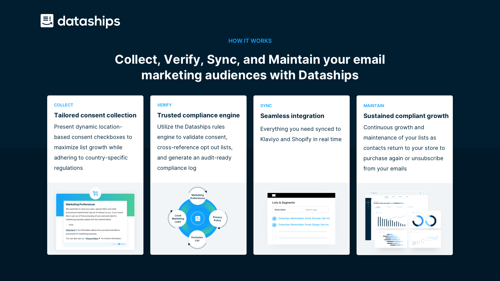 In a world of complex Email and SMS marketing laws, your default 'one size fits all' Shopify consent collection is holding you back. With Dataships you can use these laws to your advantage to maximize your growth potential while mitigating the compliance risk and instilling confidence in your marketing efforts. Install our app and start supercharging your list growth compliantly today!