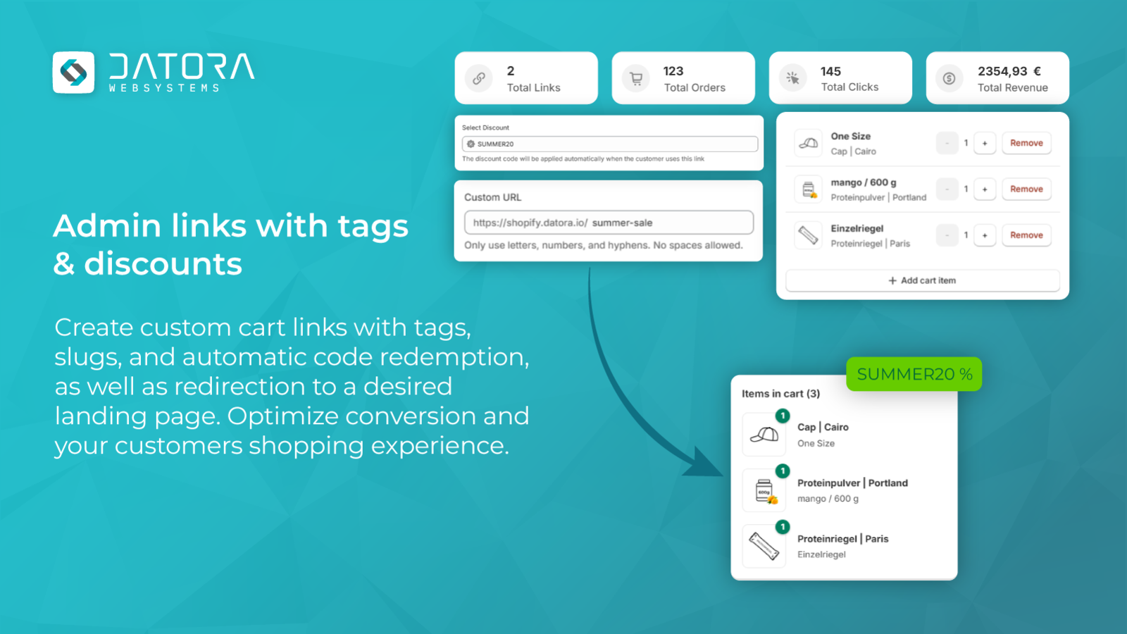 A versatile solution for creating links that automatically add previously defined products to the shopping cart when called up. The links can be created with an individual slug - ideal for influencers, campaigns or personalized promotions. Orders via these links are automatically tracked to make it possible to evaluate the sales generated and are tagged so that they can be easily filtered in Shopify. Visitors to your store can also share their shopping cart with others.