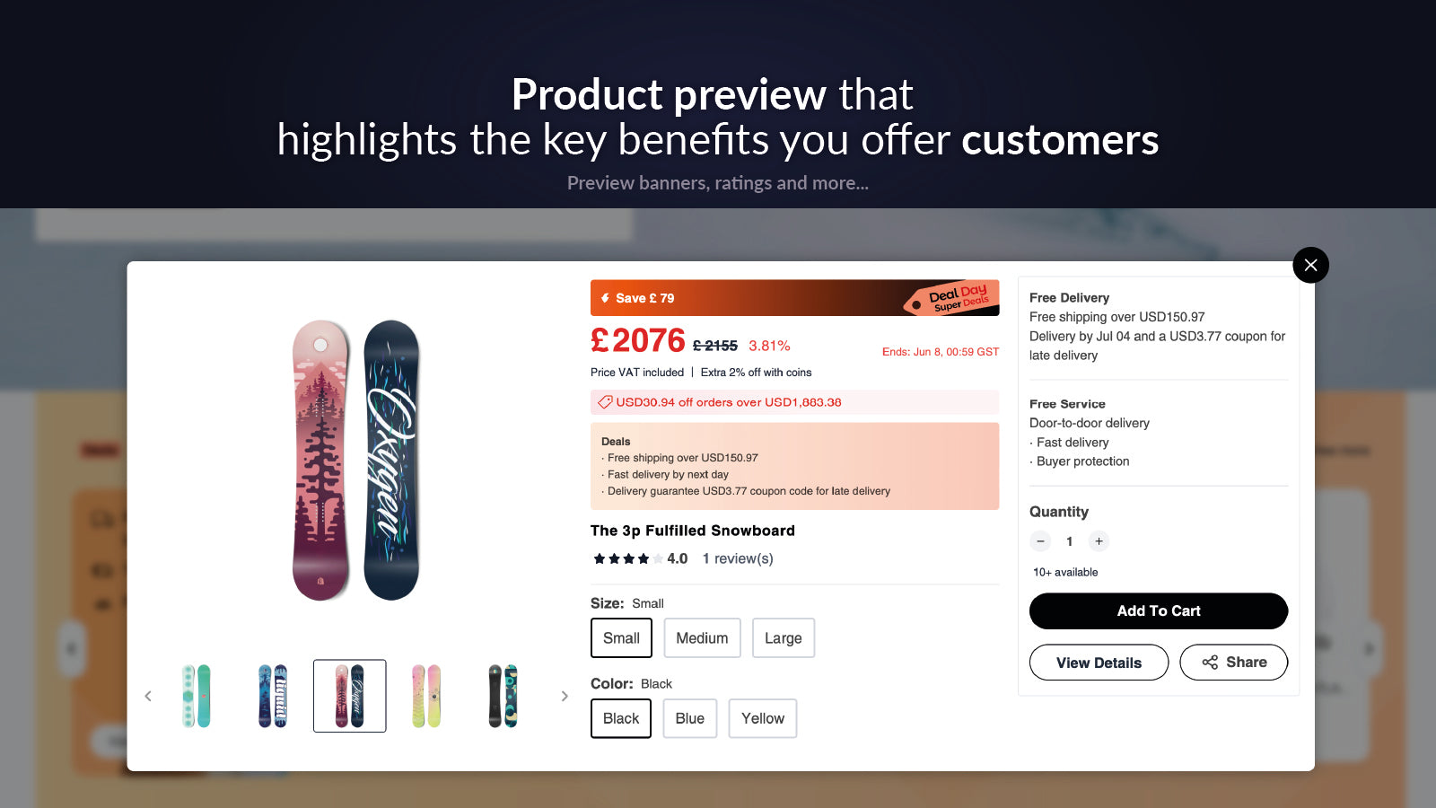 A compelling deal day carousel that displays enticing discounts, clearly outlining the product's key features and benefits with a strong, customizable call-to-action that encourages immediate purchase. A deal day preview, optimized for dropshipping, leverages industry best practices to maximize sales and customer satisfaction A deal day page section features a visually appealing layout and mobile optimization to ensure it captivates customers and drives sales.
