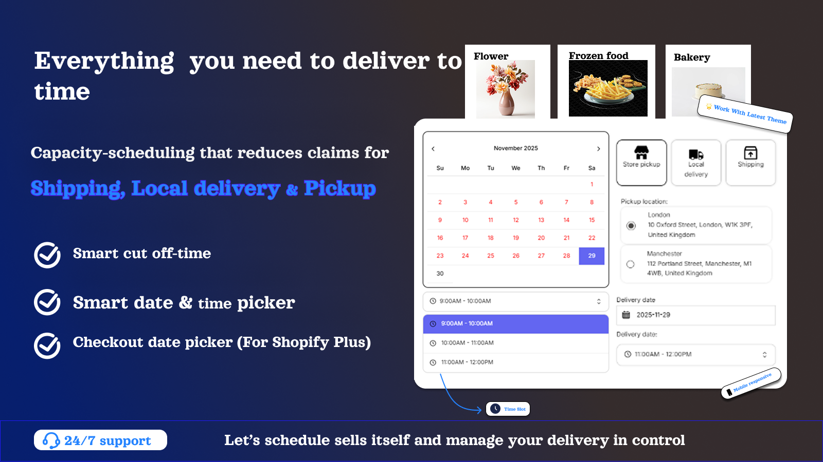 Give your customers the power to choose exactly when they want their orders. Add , same-day service. store pickup and scheduled delivery with control limits,. Our Delivery Date & Time Slot app looks great on any storefront and fits effortlessly. Need help? Our support team is here to tailor everything to your needs — and developers will l