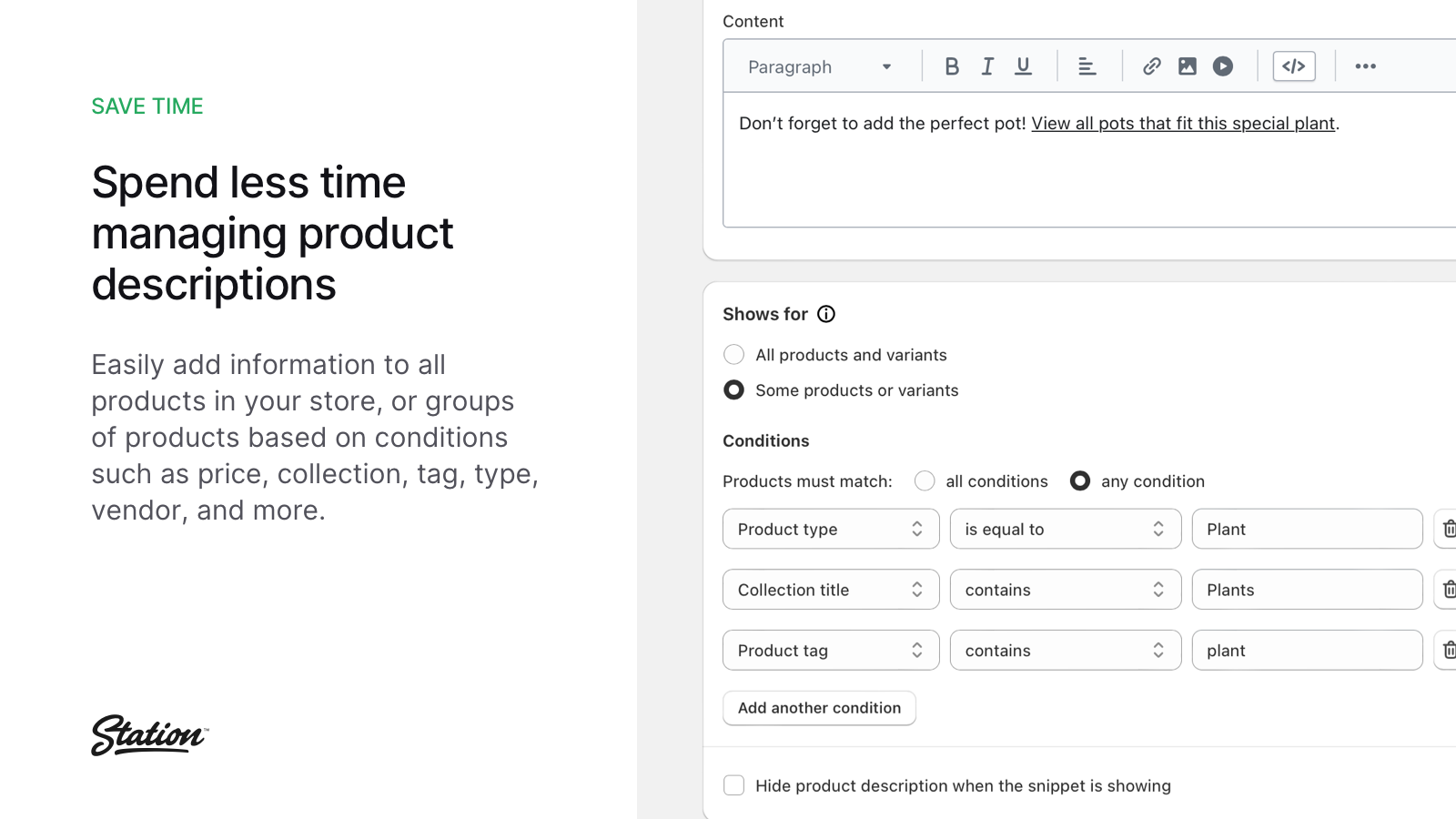 Create reusable pieces of content called snippets that extend or replace your product descriptions. Show snippets for all products, groups of products, or only when conditions are met, such as when a variant is selected or when inventory is low. Replace dozens of other apps and save time by using snippets for variant descriptions, trust badges, sizing charts, sale notices, backorder notices, shipping and returns policies, and more. The options are truly endless.