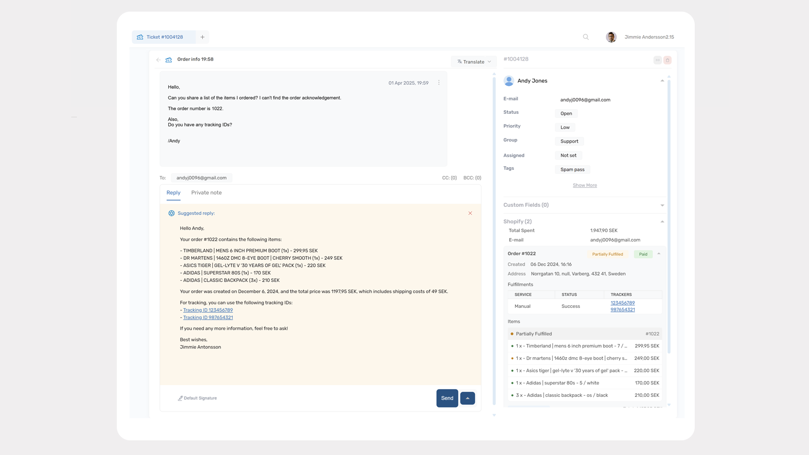 Automatically surface customer orders, fulfillment statuses, and tracking IDs inside Deskhero. When a ticket includes an order number, Deskhero fetches order details live from Shopify and suggests a ready-to-send reply. A sidebar widget displays key customer info like past orders and total spent, making support faster and more accurate.