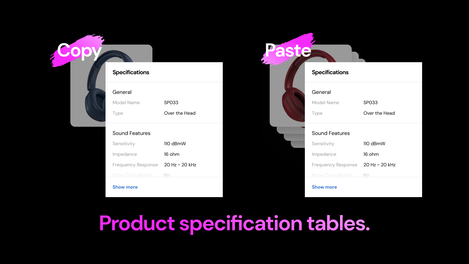 With Details+, it’s easier than ever to display specifications across all your products. Thanks to our iconic copy-paste flow, adding tables will never feel like a boring, laborious task. With the proper specs displayed across all products, imagine how easy it will be for your customers to buy with confidence and purchase more.