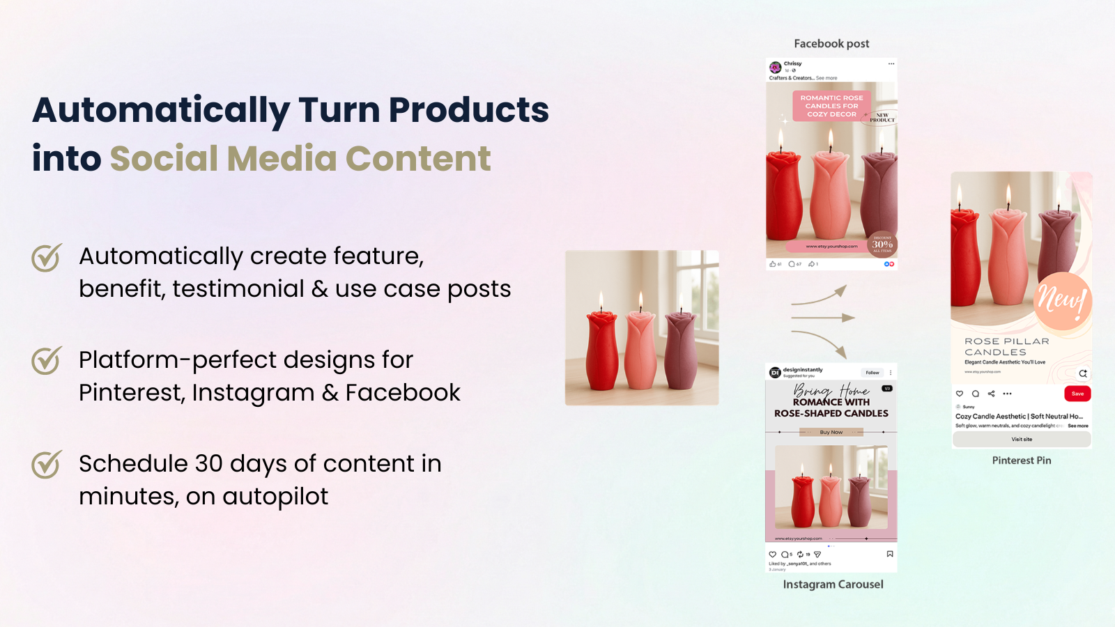 Create platform-perfect product posts, testimonials & use cases across social media. On autopilot.