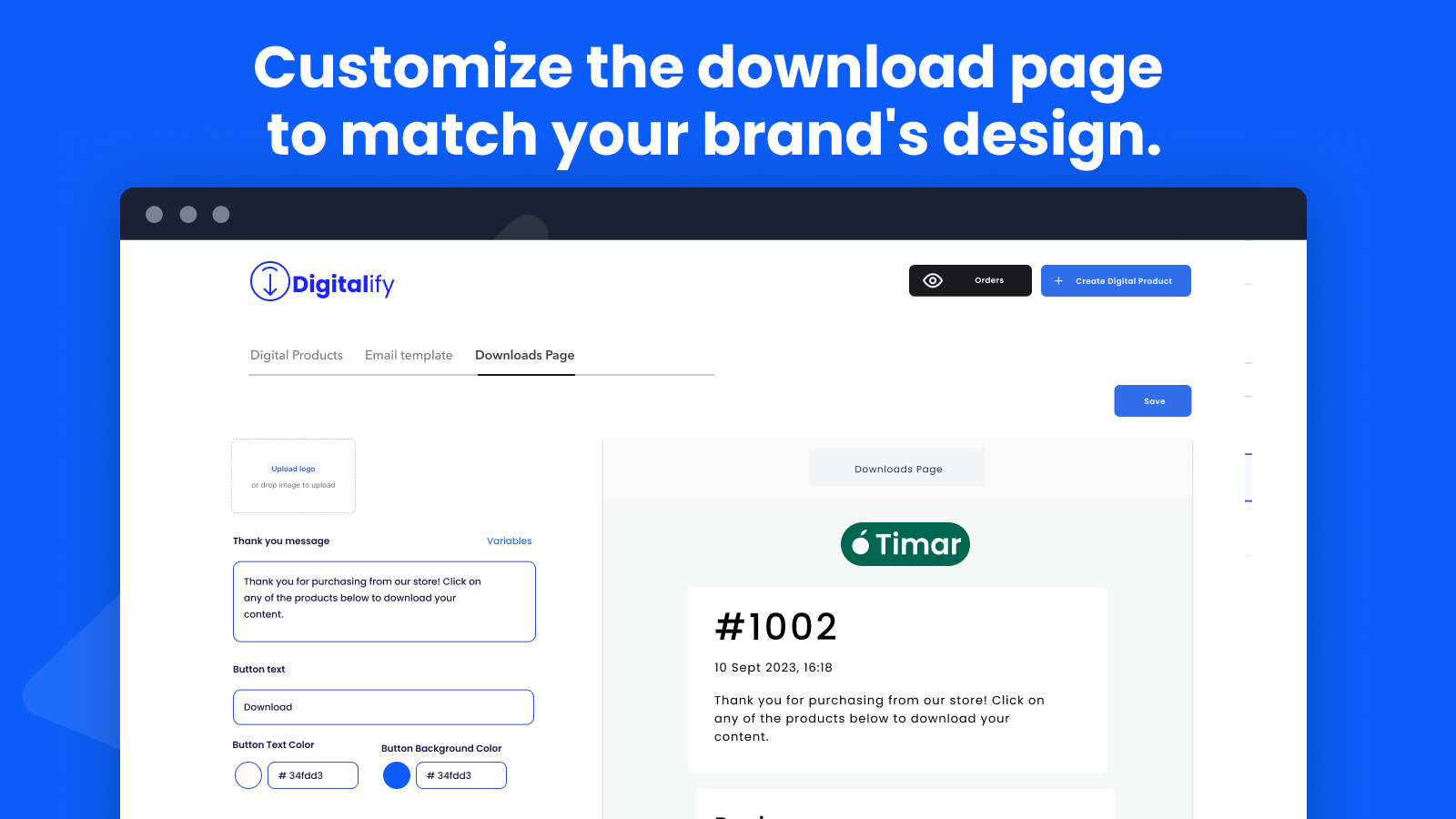 Digitalify enables the sale of digital products such as ebooks, PDFs, guides, videos, software, digital assets, licenses, and bespoke items like artwork. It's a simple three-step process: upload your files, connect them to a product listing, and activate email delivery. Tailor every aspect to align with your brand identity. Effortlessly provide customers with immediate access to their digital purchases right after checkout. Customize the entire experience to reflect your brand’s aesthetics