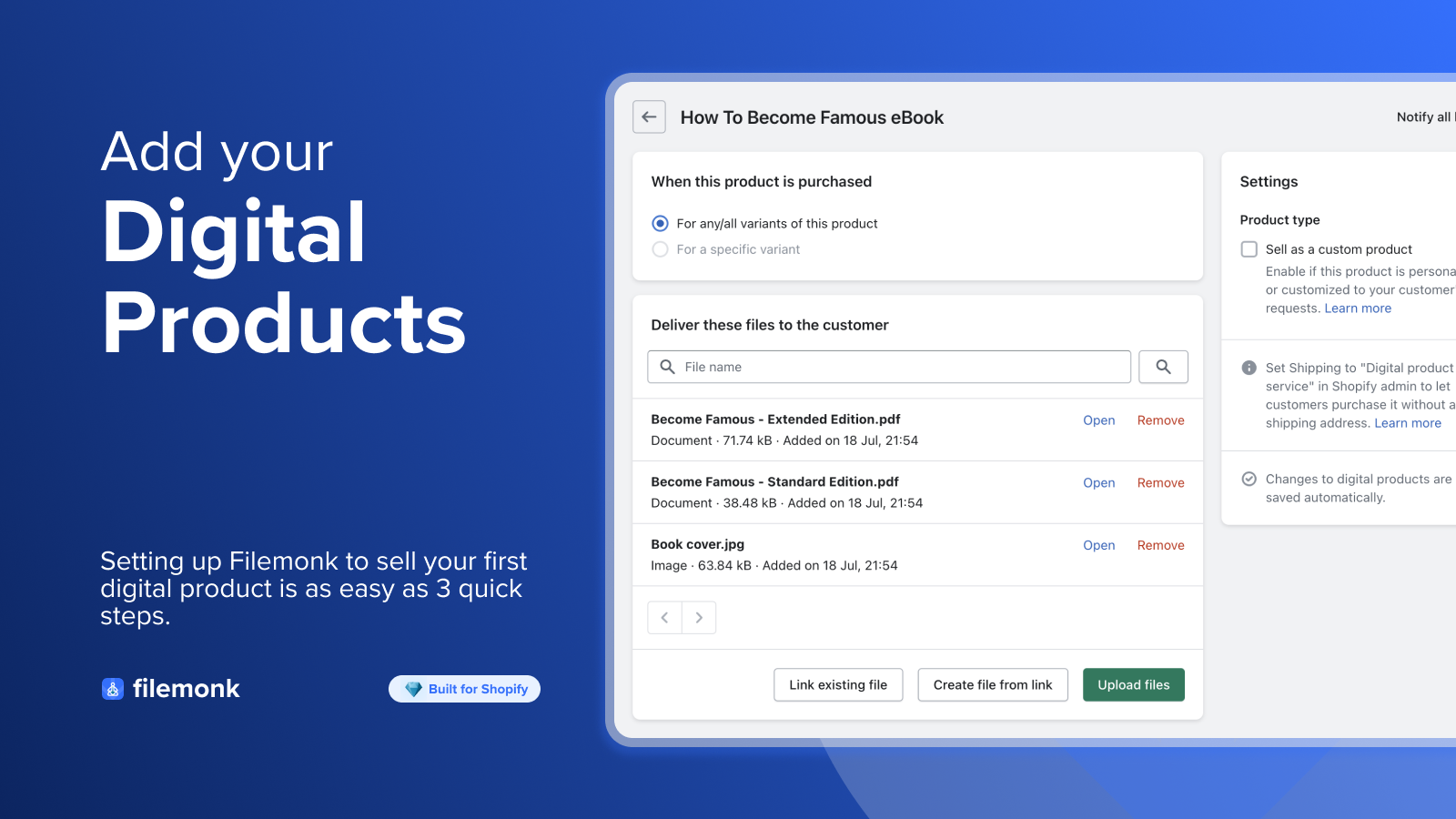Filemonk makes it easy to sell digital products - be it ebooks, PDF, guides, videos, software, digital assets, licenses, custom products like artwork & more. Just 3 steps - upload your files, link them to a product listing & enable email delivery. That's it! Give customers instant access to their digital downloads automatically after checkout. Customize everything to match your brand. Set download limits, disable risky/refunded order access or watermark PDFs to protect from sharing.