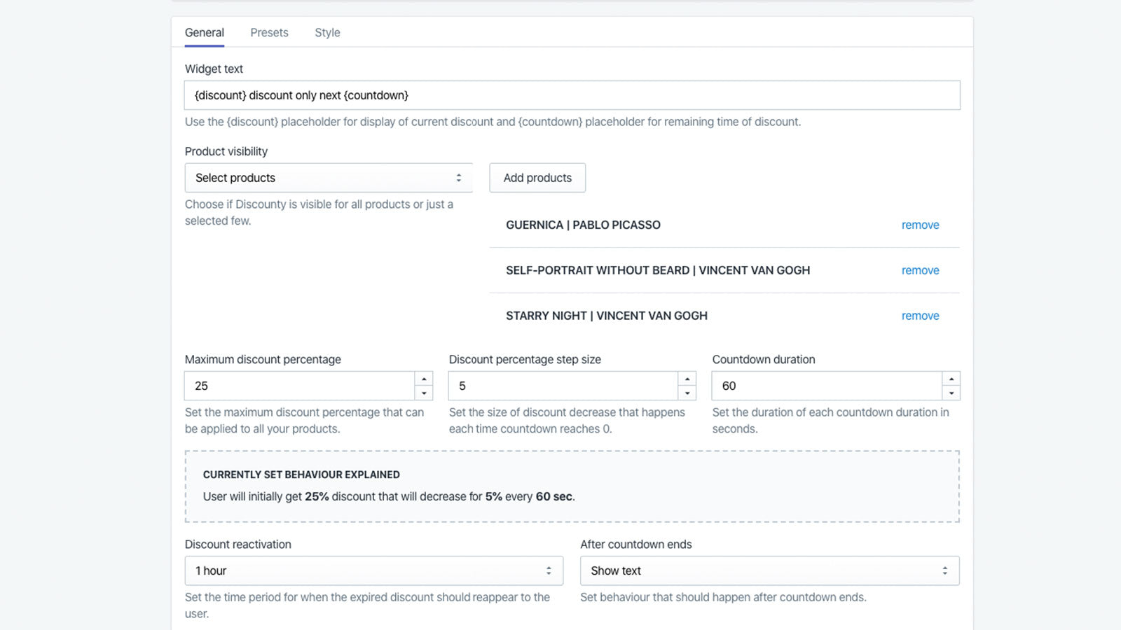 Discounty was designed to be exceptionally user friendly, even to those who are completely new to Shopify apps. There are three key things you need to set. One, the highest (starting) and the lowest (final) discounts. Two, a step-size that represents the value for which the discount will decrease until it reaches the final discount. Three, the time interval in which the discount decreases (for example: every 60 seconds the discount will decrease by 5%). That’s it!