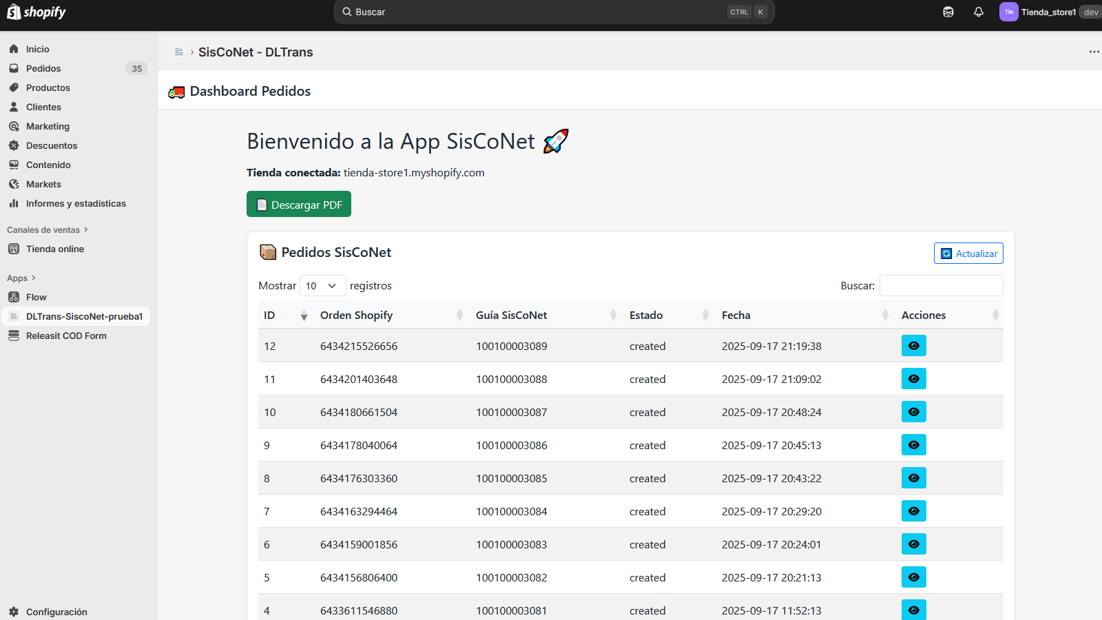 Aplicación de la transportadora DLTRANS para el envío y gestión de pedidos.